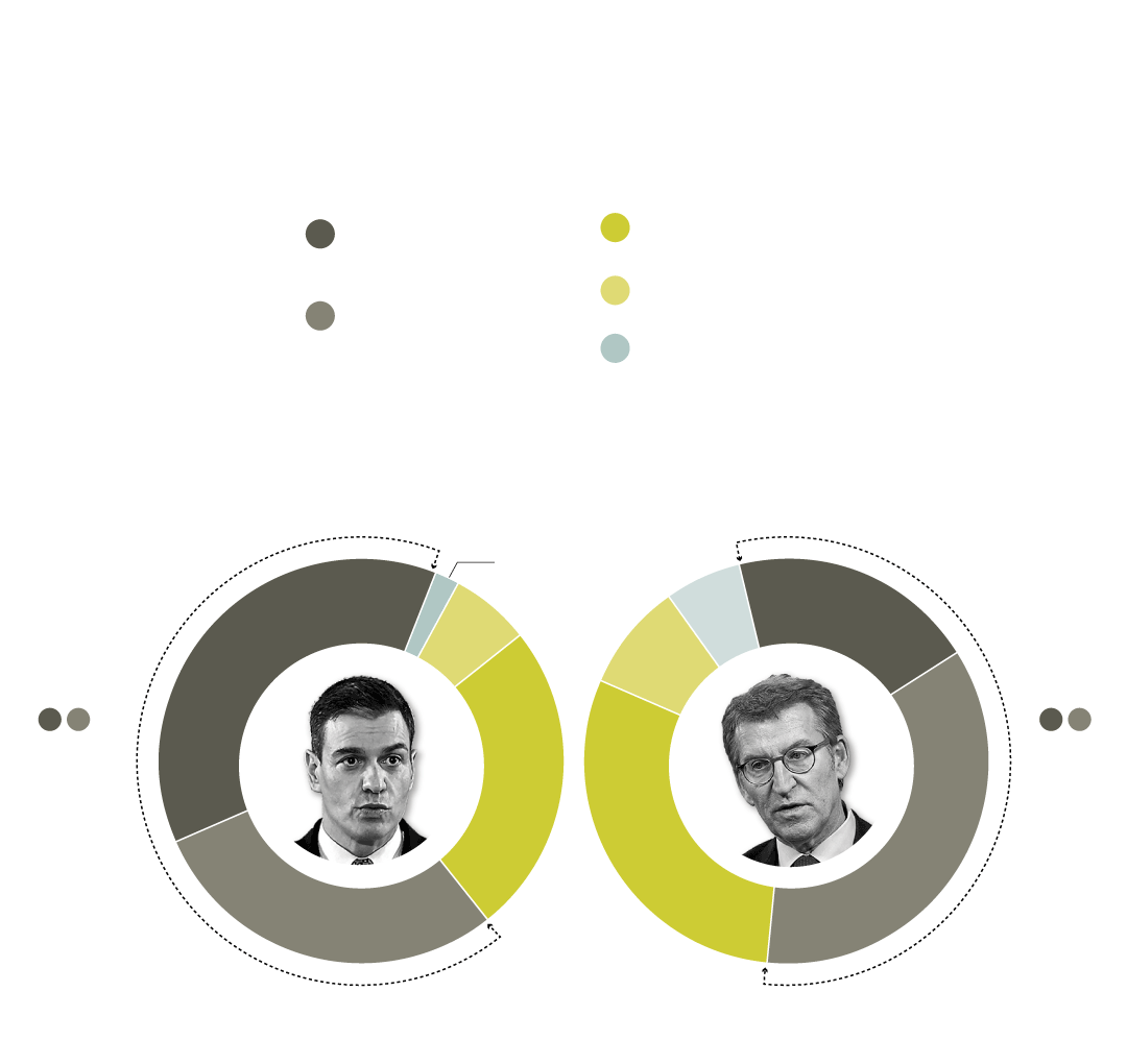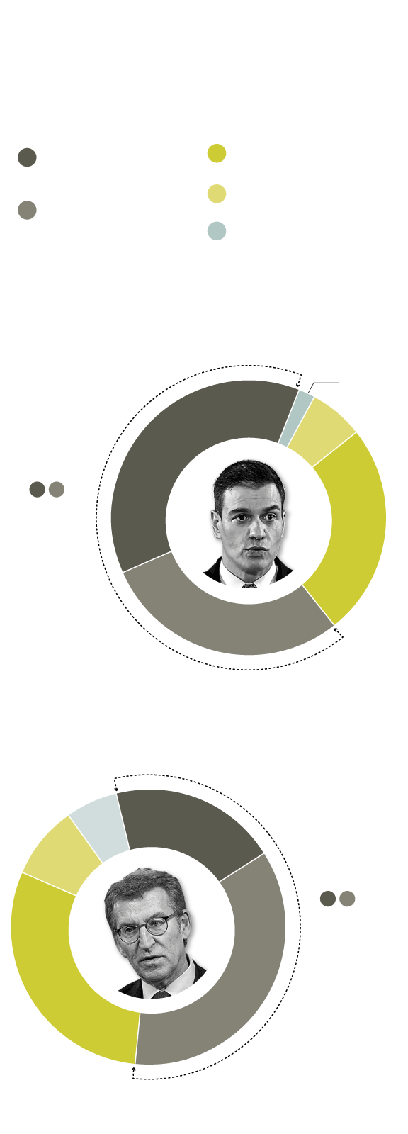 El único apartado del sondeo, además de el de estimación de voto, en el que Sánchez sale mejor parado que Feijóo es el que pregunta a los encuestados a quién prefieren como presidente del Gobierno. Un 22 por ciento le elige, mientras que un 16 por ciento opta por Feijóo. En tercer lugar, con un 9 por ciento de preferencia, aparece Díaz, y en cuatro lugar Abascal, con un 5 por ciento. En esta pregunta, realizada de manera espontánea a los españoles, se cuela con casi un 5 por ciento (4,4%) la presidenta de la Comunidad de Madrid, Isabel Díaz Ayuso . Un porcentaje nada desdeñable tratándose de la única líder autonómica que aparece.