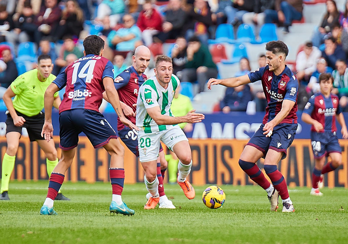 El Levante asustó a balón parado con un disparo de falta de Pablo Martínez, que se estrelló en el poste. El cuadro blanquiverde creció en la recta final de la primera mitad y sobre todo supo ser solidario defensivamente ante las múltiples bajas en defensa de la plantilla. Los últimos minutos del primer tiempo fueron del Córdoba con múltiples llegadas. La más clara fue un centro de Carracedo, que conectó con Casas, pero el disparo se estrelló en un defensa. Al descanso, sin goles, pero con buenas sensaciones entre los chicos de Iván Ania.