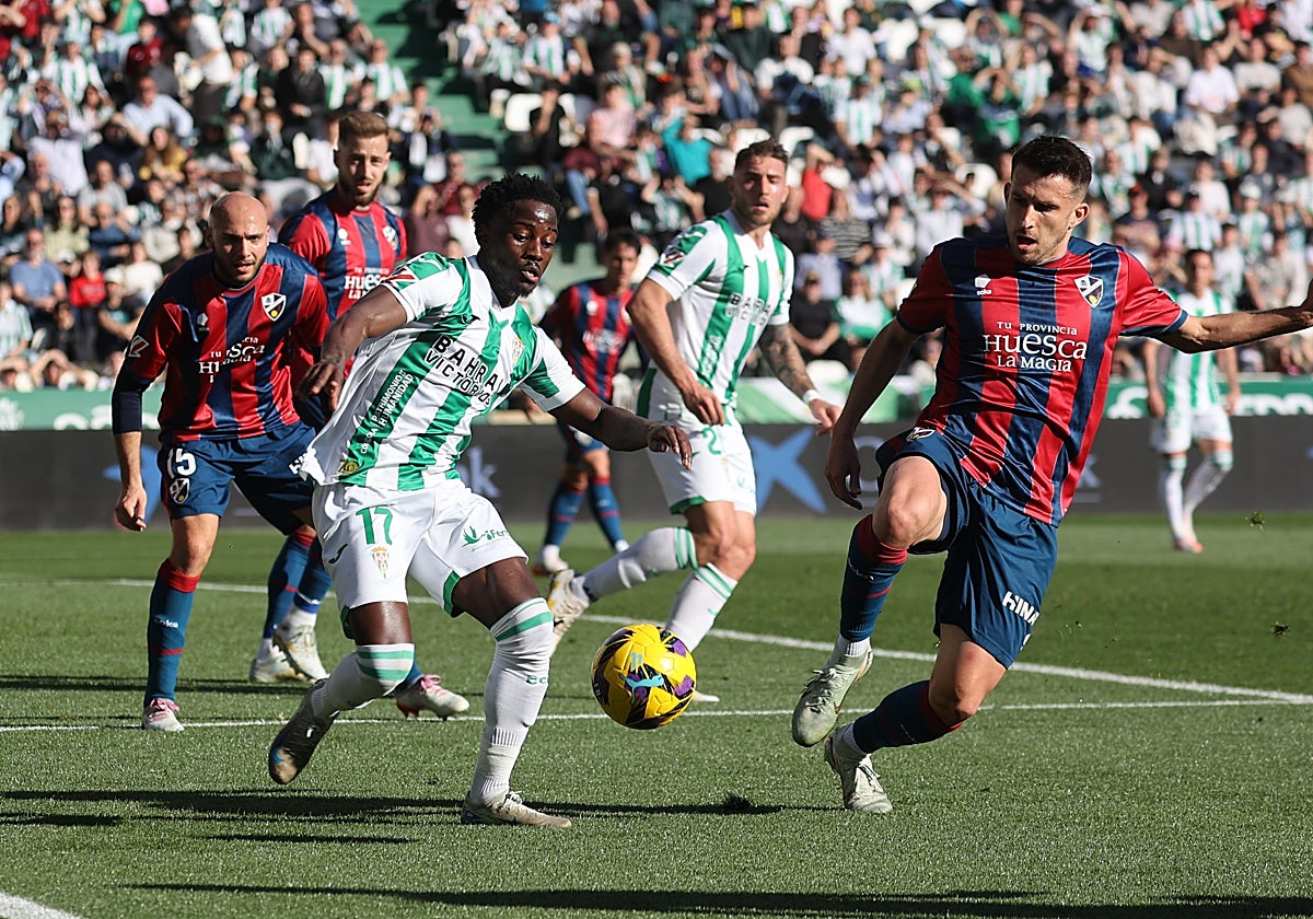 Apenas le dio opción el Córdoba al Huesca, que generó peligro solo en las acciones a balón parado cercanas al descanso. Adilson, que estaba siendo un quebradero de cabeza para Loureiro en banda, llegó en una ocasión hasta línea de fondo, pero no logró dar el último pase a Antonio Casas, que estaba solo para empujar el balón. Múltiples embestidas blanquiverdes y mucha solidez en defensa, con un buen Marvel en su duelo particular con Soko. Destacaron también Magunazelaia o Álex Sala, que movieron el centro del campo a su antojo y generaban peligro constante.