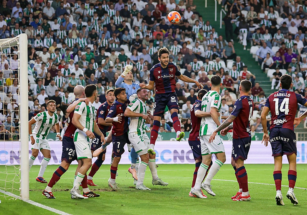 La primera llegada blanquiverde tuvo el nombre de Álex Sala con un disparo desde la frontal que se marchó excesivamente alto. Y el Levante, en la primera clara que tuvo, marcó el primero. Brugué finalizó con calidad una recuperación en el campo del Córdoba tras pérdida de Carracedo. Después de llevarse todos los rechaces, adelantó a los suyos dejando frío a El Arcángel (0-1, min. 16). Una vez más, la contundencia del cuadro blanquiverde brillaba por su ausencia.