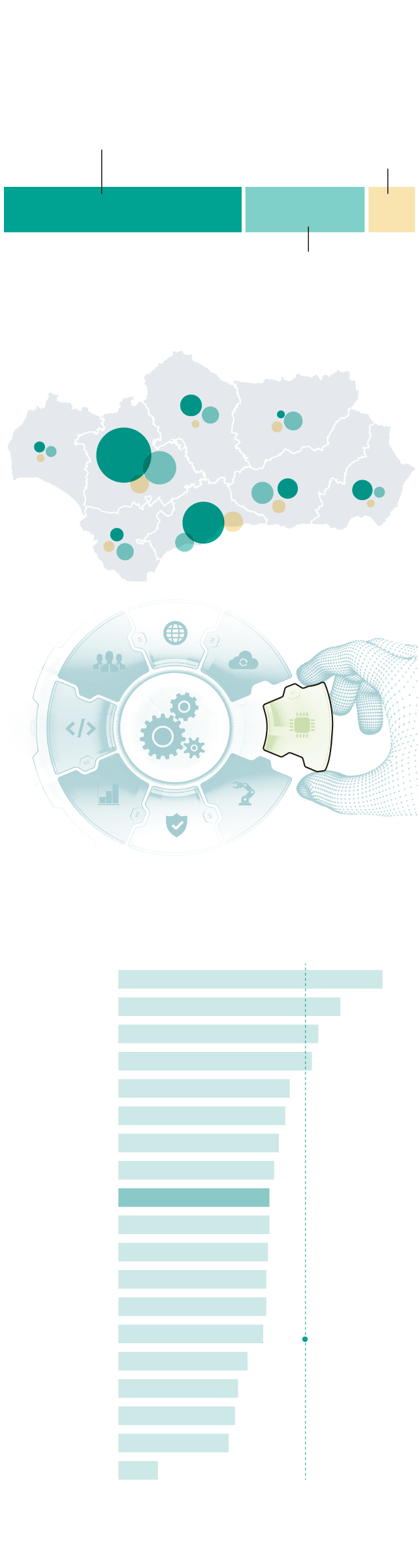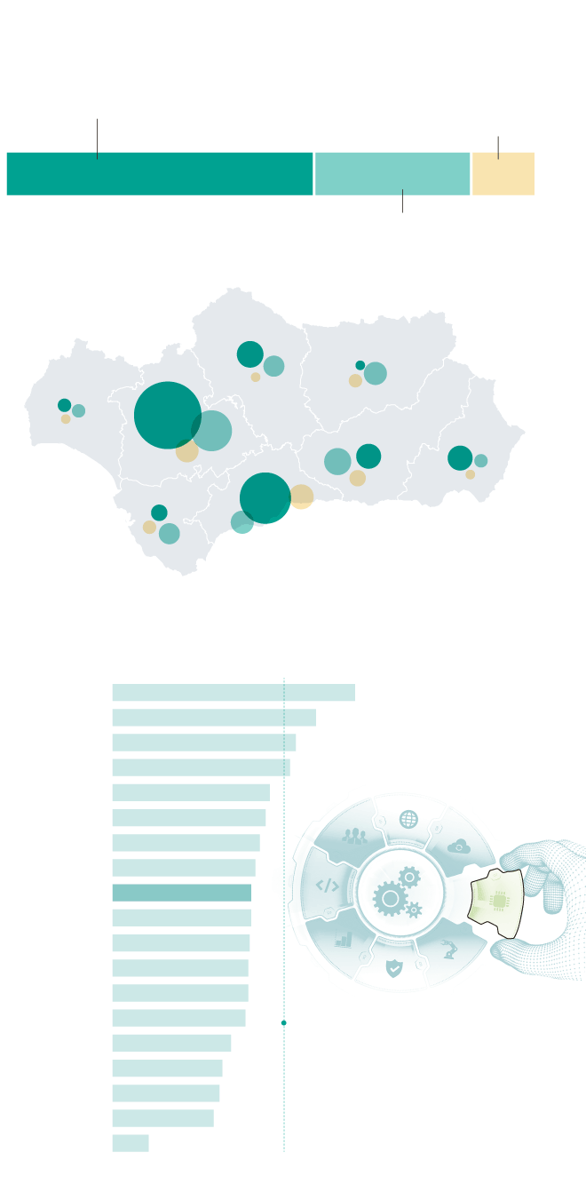 Así, en la comunidad autónoma existen al menos 189 entidades que operan en el ámbito de la IA, de las que 110 son de ámbito empresarial -como empresas de la Tecnología de la Información (TIC)-, 56 instituciones generadoras de conocimiento y 23 infraestructuras científicas y tecnológicas. Como se puede observar en el gráfico que ilustra esta información, Sevilla y Málaga son las provincias de Andalucía que tienen más compañías y entidades de este tipo, mientras que Huelva, Jaén y Almería se encuentran en una posición más relegada.