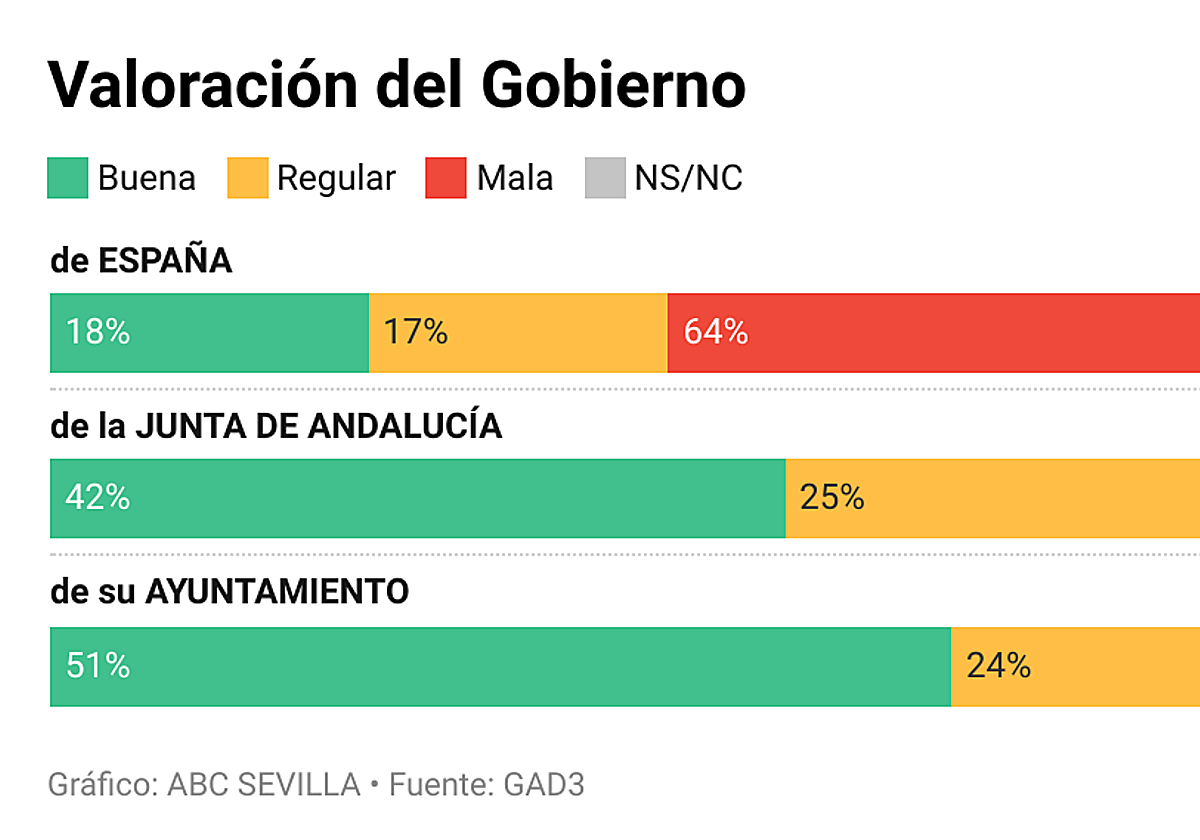 Iniciar sesiónRemarcando una tendencia que viene ya sostenida en el tiempo desde hace varios años, la gestión de la Junta de Andalucía es mejor valorada que la del Gobierno central por los encuestados. El trabajo de campo realizado por GAD3 para ABC indica el ... 42% de los andaluces valora como buena la gestión de la Administración andaluza, muy por encima del 18% que aprueba al Gobierno de España. Ni dos de cada diez ciudadanos muestra su apoyo al Ejecutivo central. Hasta un 64% de los encuestados, de hecho, indica que la gestión del Gobierno del socialista Pedro Sánchez es 'mala', mientras otro 17% se queda en el 'regular' como calificación.