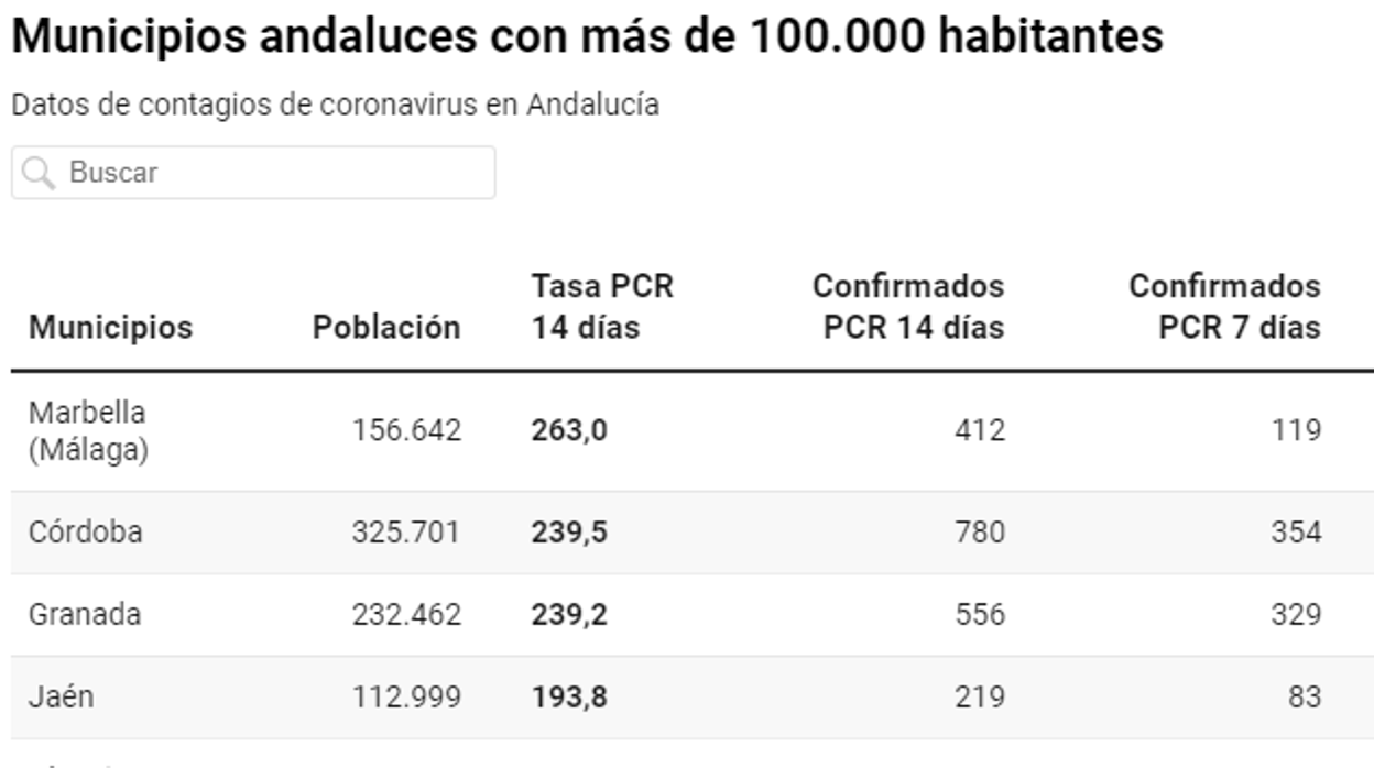 Según los datos actualizados de la Consejería de Salud y Familias este miércoles, sólo tres de los doce municipios andaluces con más de 100.000 habitantes superan los 200 casos de Covid en las últimas dos semanas, Marbella (Málaga) con una tasa de 279 y 400 casos confirmados en 14 días; Córdoba , con una incidencia de 239,5 y 780 contagios por PCR en dos semanas; y Granada , con una tasa de 239,2 y 556 positivos por PCR en 14 días.