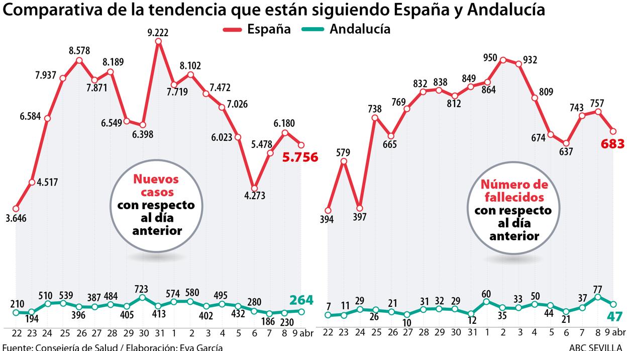 El número de casos de coronavirus en Andalucía es ya de 9.261, según datos del Ministerio de Sanidad . Esto significa que, en las últimas 24 horas, se han sumado 264 positivos. El dato significa un ligero repunte de nuevos casos de ... infección con respecto a los últimos días, cuando las cifras fueron de 230 y 180 personas infectadas cada día. Sin embargo, la cifra se encuentra lejos de la media de la última semana, que está en 327 nuevos positivos diarios.