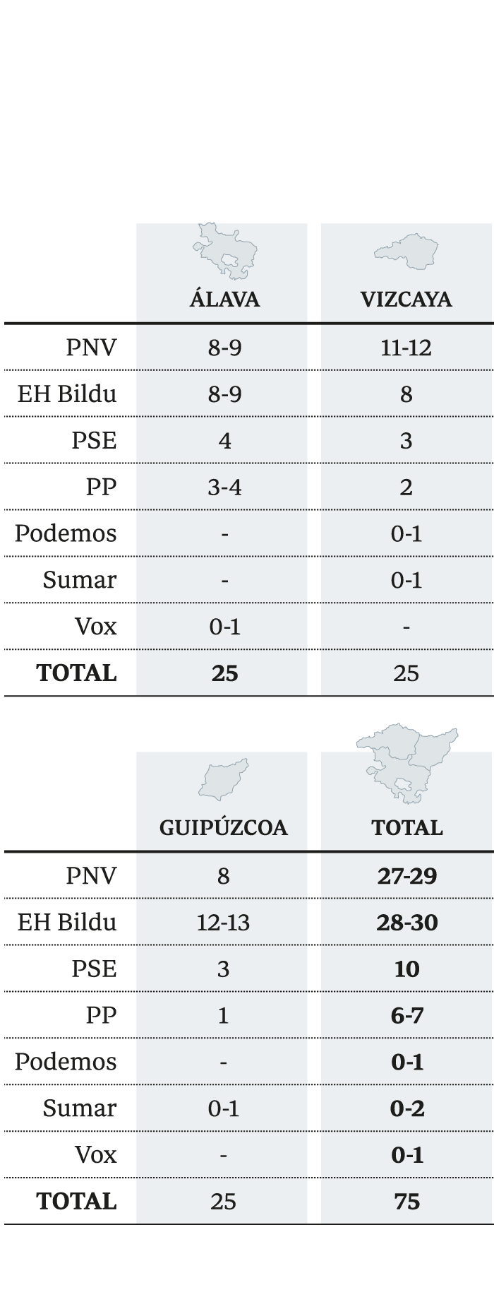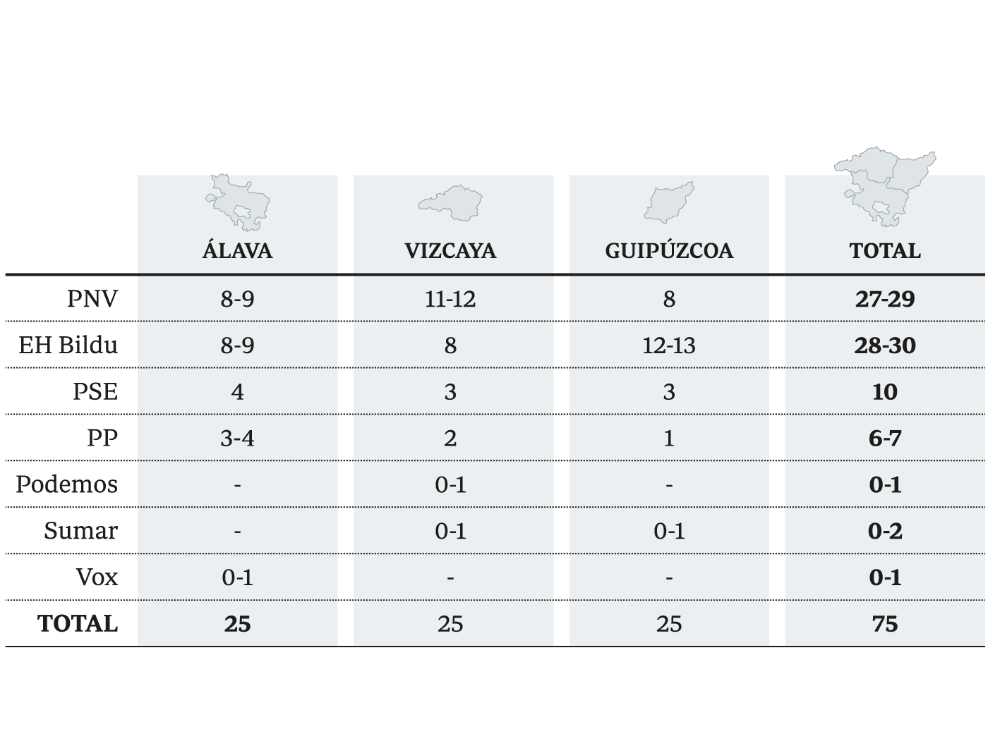 Y es que ganar en sufragios no implica hacerlo en escaños. De hecho, el sondeo de GAD3 señala que el más votado en todo el País Vasco será el PNV, con un 35,6% de las papeletas. Casi un punto y medio más que Bildu (34,2%), pero con hasta tres sillones menos, aunque Pradales también puede ganar a Otxandiano en escaños por la mínima (29-28) según cómo uno y otro rentabilicen sus respectivos resultados en cada una de las tres provincias.