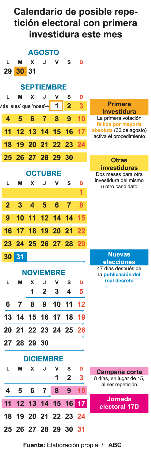 Superadas esas tres semanas del mes que viene, la primera fecha factible para una nueva investidura sería el 27 de septiembre. En ese caso la repetición electoral pasaría el 14 de enero, habiendo así margen para que la semana de campaña electoral se celebrase ya fuera del periodo navideño.