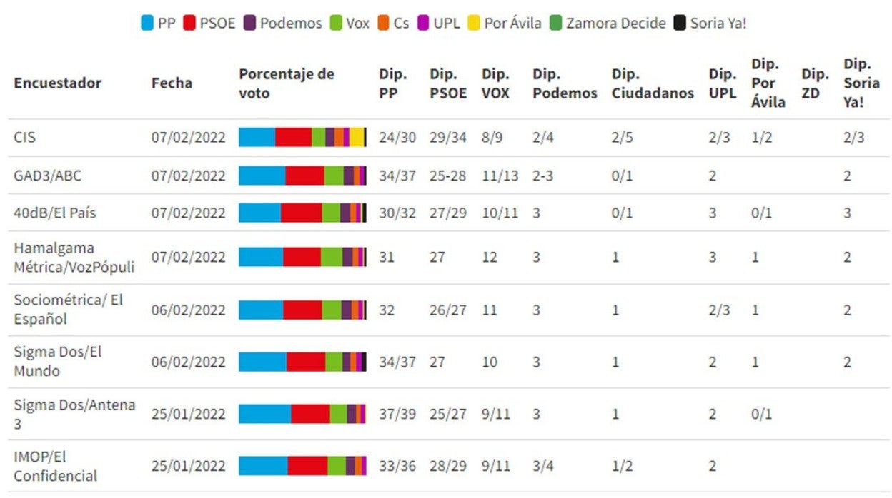 El resto de sondeos publicados en medios como El País, El Mundo, El Confidencial o el propio ABC , tal y como se observa en la tabla superior, dibujan un escenario bien distinto: el próximo 13 de febrero el PP podría relanzarse como la como la lista más votada, consiguiendo entre el 30,8% de los votos (40db/El País) y el 39,2% (SigmaDos/Antena 3), lo que se traduciría entre 30 y 39 procuradores.