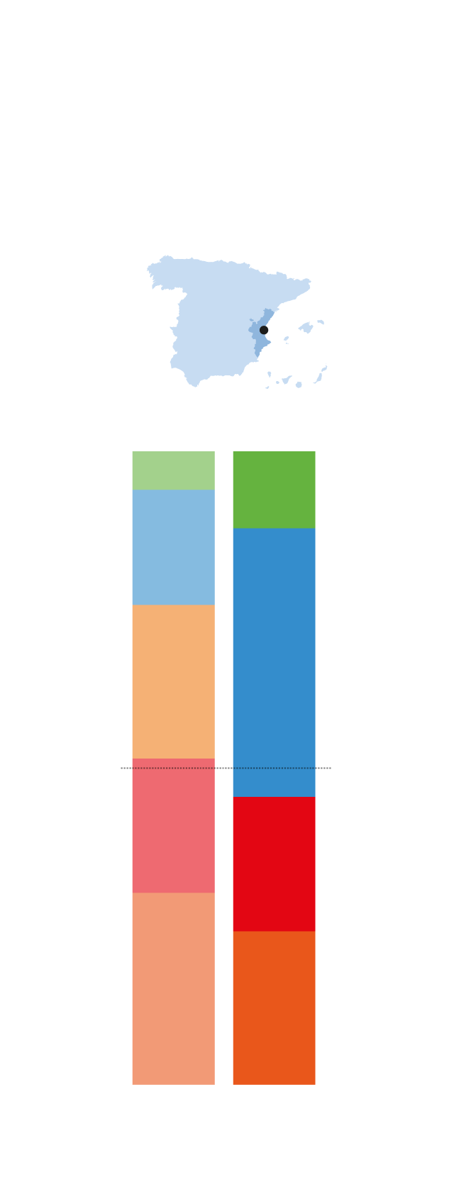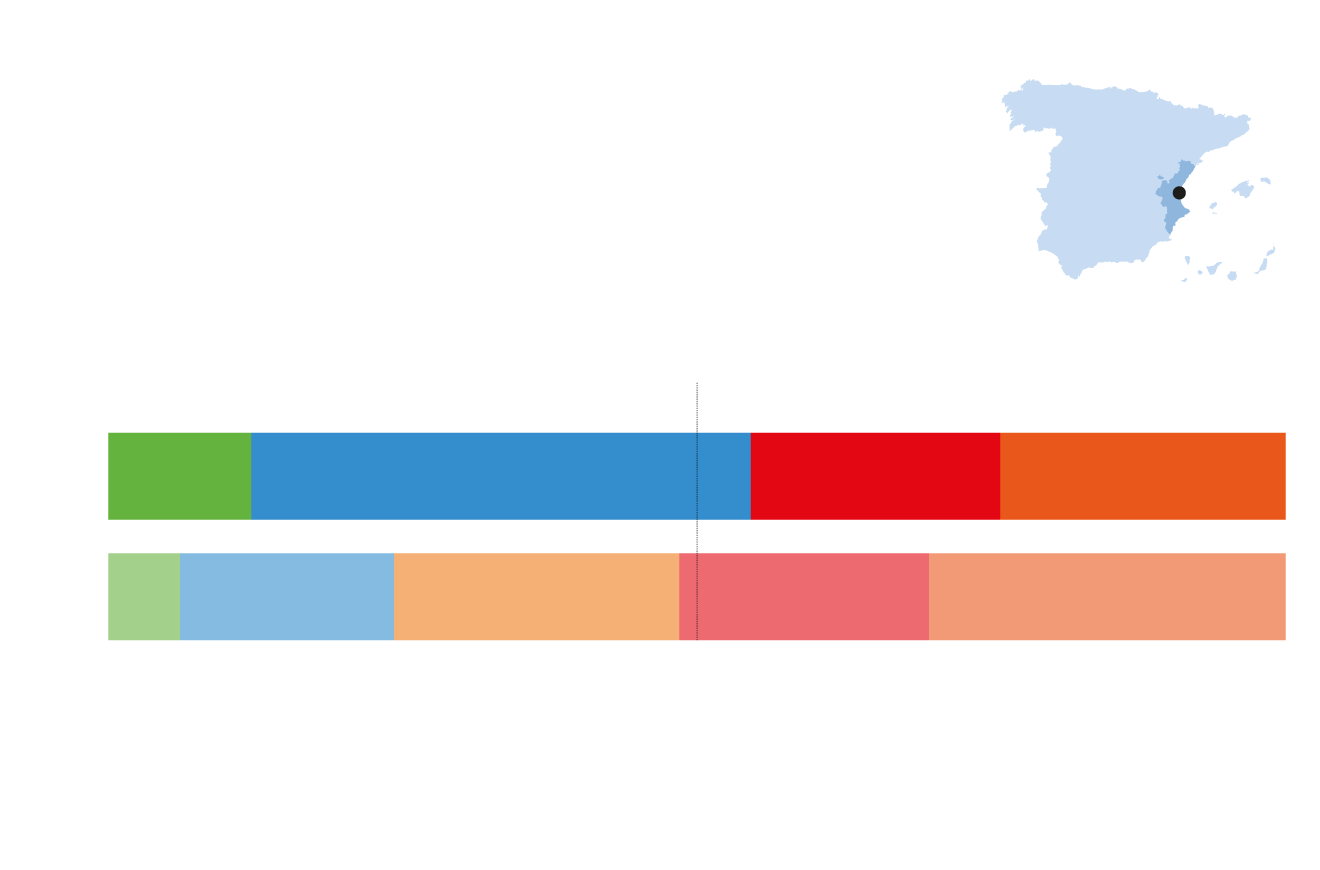 En el consistorio valenciano se sientan 33 concejales. La mayoría absoluta se sitúa por tanto en 17 actas. Català lograría el bastón de mando de la mano de Vox, que entraría con 3-4 concejales al lograr el 10% de los votos. La derecha suma 17-18. Aunque Català gana con claridad las elecciones, la suma es mucho más ajustada porque ninguna de las fuerzas del bipartito de gobierno se desploma. Sí sufre desgaste el alcalde, Joan Ribò: pierde cuatro puntos; del 27,4% al 23,4%. Pero eso solo se traduce en concejales en un descenso de los 10 actuales a entre 8 y 9 ediles.