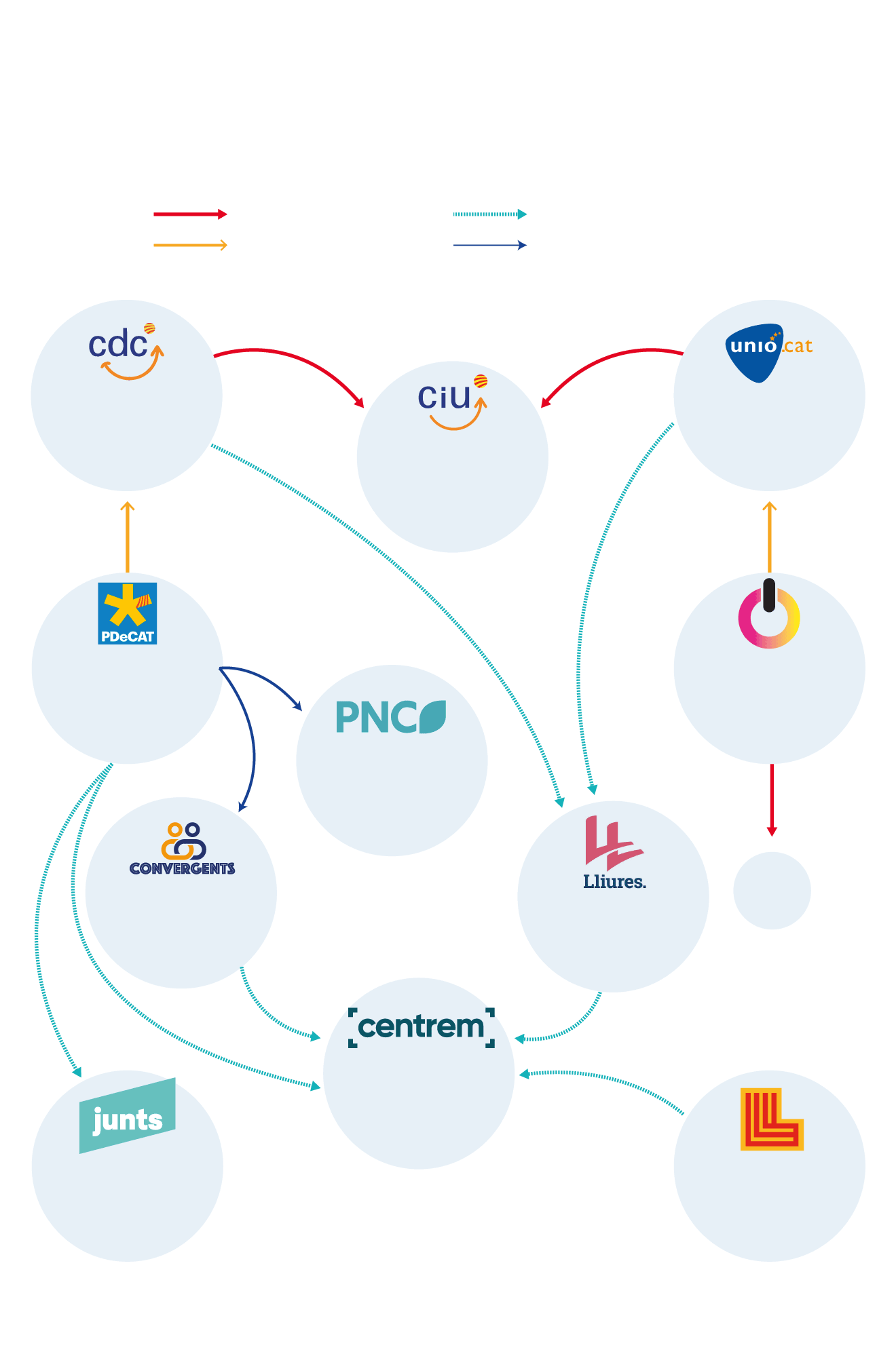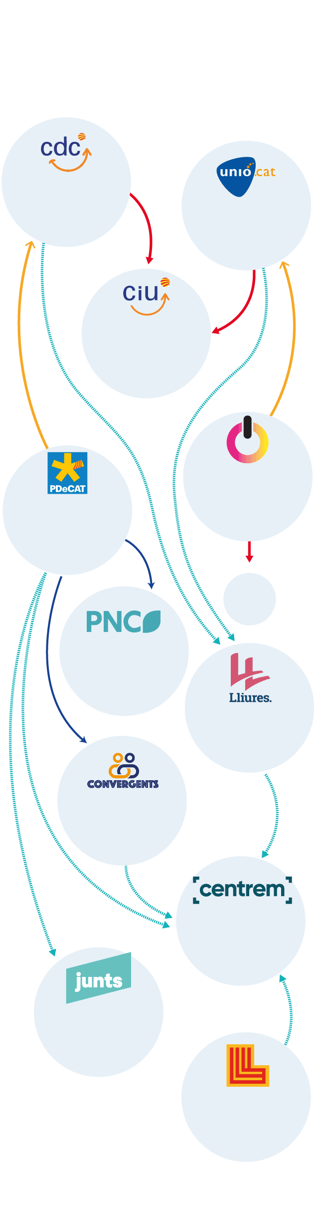 Sin Pujol y sin la marca CDC, del PDECat –transformado ya en independentista– se escindieron en 2017 y 2020, respectivamente, Convergents, liderado por Germà Gordó –uno de los principales encausados en la trama del 3 por ciento en la Audiencia Nacional–, y el Partit Nacionalista de Catalunya (PNC), formación creada y controlada por Marta Pascal. Al tiempo, Antoni Fernández Teixidó (CDC) y Roger Montañola (UDC) pusieron en marcha Lliures, con la idea de presentar un partido de corte liberal y catalanista.