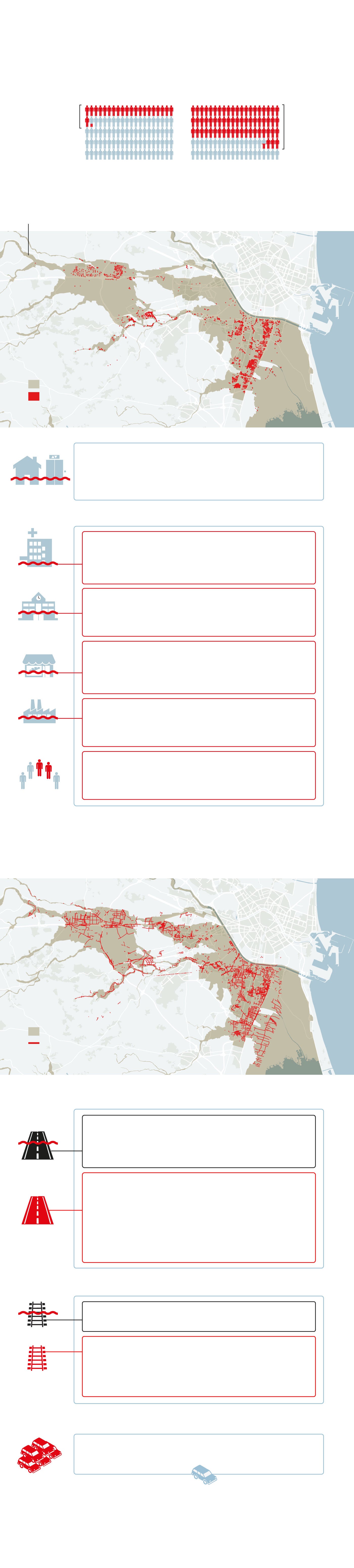 Sin una cifra oficial de desalojados tras proceder a la demolición total o parcial de 363 viviendas, alrededor de 3.000 alumnos esperan en barracones a que la Generalitat reconstruya o rehabilite los ocho centros educativos que quedaron más dañados. Con la circulación normalizada en las carreteras y en el Metrovalencia, el Ministerio de Transportes no ha puesto fecha todavía a la recuperación del tramo de la línea C-3 de Cercanías entre Utiel y Aldaia. 76 kilómetros necesarios para conectar por tren el interior con la ciudad de Valencia.