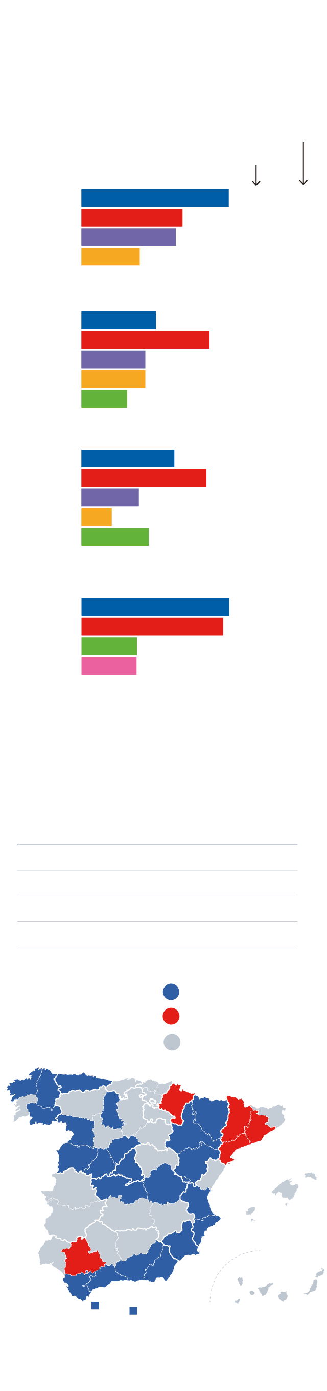 Por territorios, destacó su caída en Castilla y León, por ser la más pronunciada (de seis a cinco escaños) y producirse en la primera autonomía en la que logró entrar en el gobierno. En Murcia, donde no ha logrado entenderse con el PP, cayó de tres a dos diputados. En votos, la formación de Abascal perdió más de 600.000, superando por poco los tres millones de votos (el 12,4 por ciento) y sacando a Sumar menos de 20.000 papeletas.