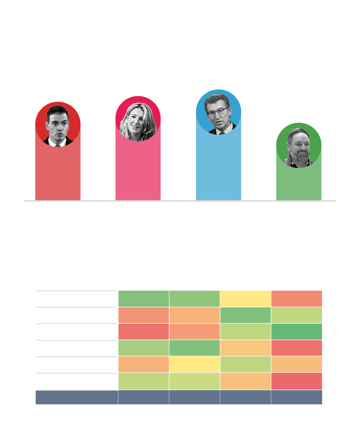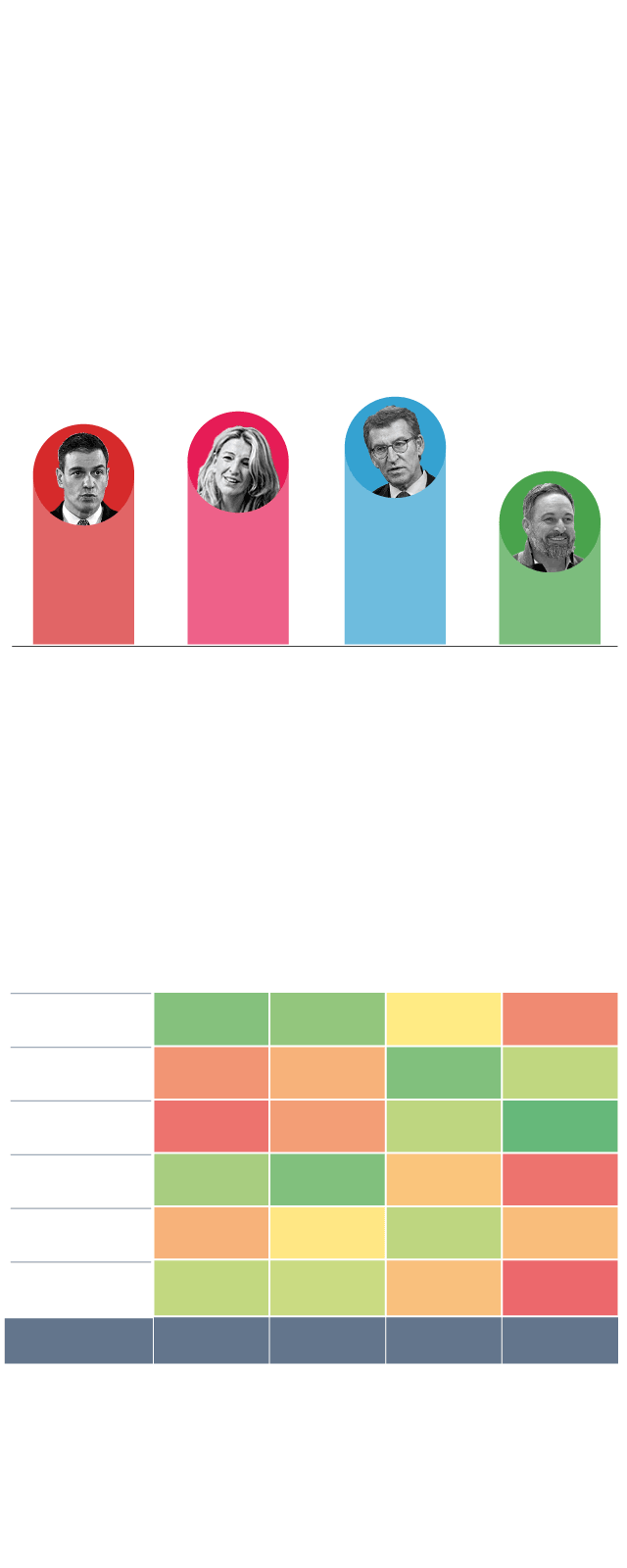 En el bloque de la derecha, Santiago Abascal logra un 7,9 entre sus propios votantes y un 5,2 entre los del PP. Los de CS le suspenden con 2,5. Tanto Abascal como Feijóo están en notable entre sus votantes y aprueban en el electorado del socio-rival. En los análisis de transferencia de voto ambos partidos se están intercambiando sufragios. En la izquierda también se produce una situación similar. Pedro Sánchez obtiene un 7 entre sus votantes, un 5,9 en Unidas Podemos y un 5,1 entre los nacionalistas. Mientras que Yolanda Díaz logra un 7,2 entre los suyos, un 7,7 entre los del PSOE y un 5 entre los partidos nacionalistas e independentistas. Ninguno de los dos es competitivo en el bloque de la derecha. Con la curiosidad de que Díaz (3,4) es mejor valorada por los votantes de CS que Sánchez (2,3).
