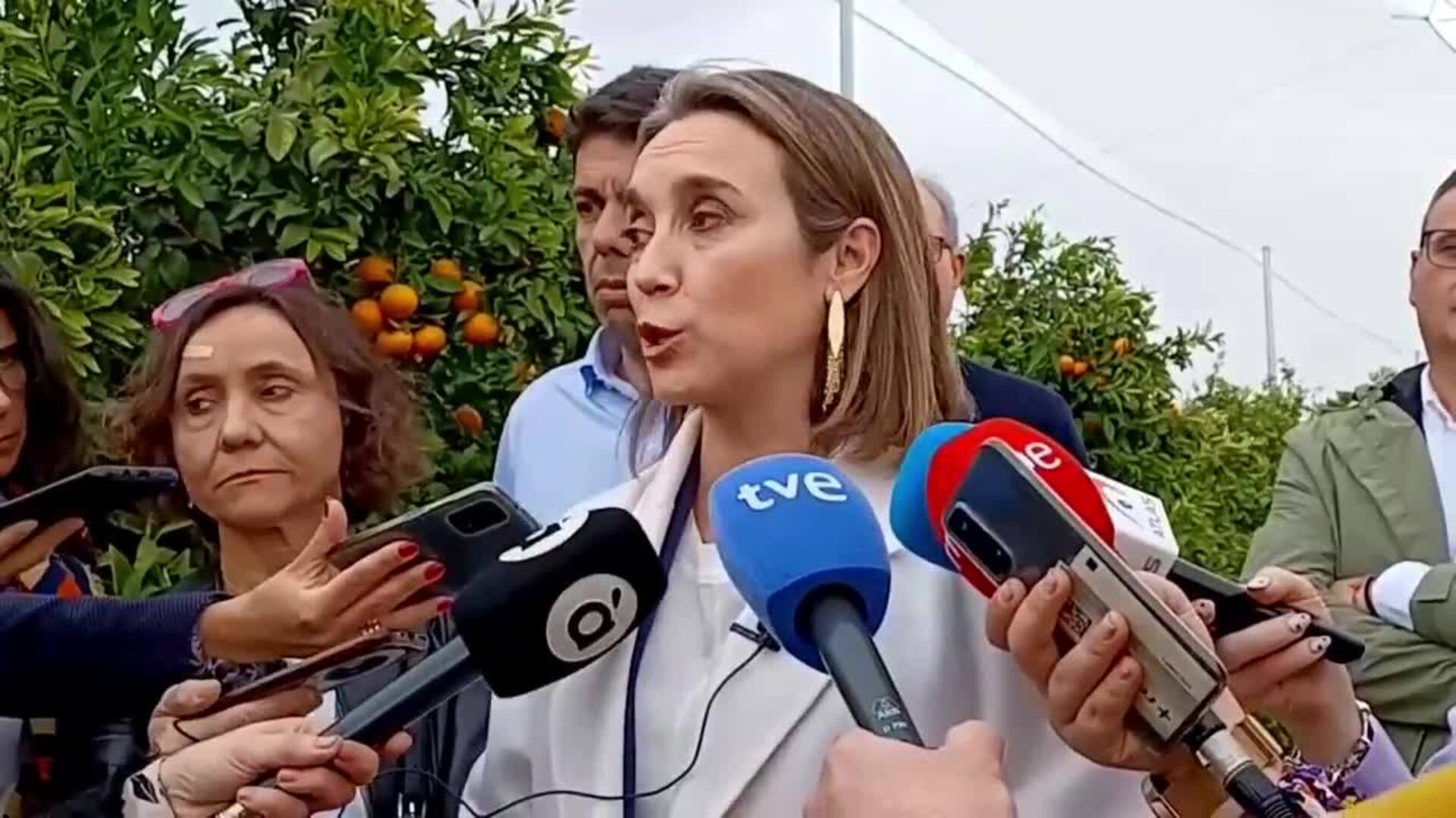 Tous (Valencia), 22 feb (EFE).- (Imágenes: Eva Batalla).- La secretaria general del PP, Cuca Gamarra, ha asegurado este jueves que "a los únicos que corresponde" determinar qué delito hubo en el caso Tsunami es a los jueces.t Gamarra se ha manifestado así a preguntas de los periodistas sobre su valoración del informe de la teniente fiscal del Tribunal Supremo de que hay que investigar a Carles Puigdemont por terrorismo en el caso Tsunami. TOTALES DE CUCA GAMARRA, SECREATARIA GENERAL DEL PP. IMÁGENES DE LA VISITA DE GAMARRA JUNTO A MAZÓN A UNA FINCA DE CÍTRICOS DE TOUS, VALENCIA.