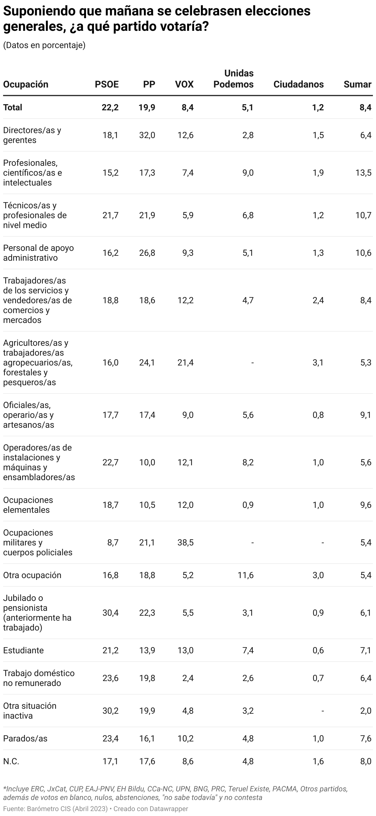 En general, según la media de todas las variables, el PSOE se llevaría el 22,2% de los votos, mientras que el 19,9% sería para el PP. Los socialistas son especialmente atractivos para el votante jubilado (30,4%), mientras que los populares son aclamados por los directores y gerentes (32%).