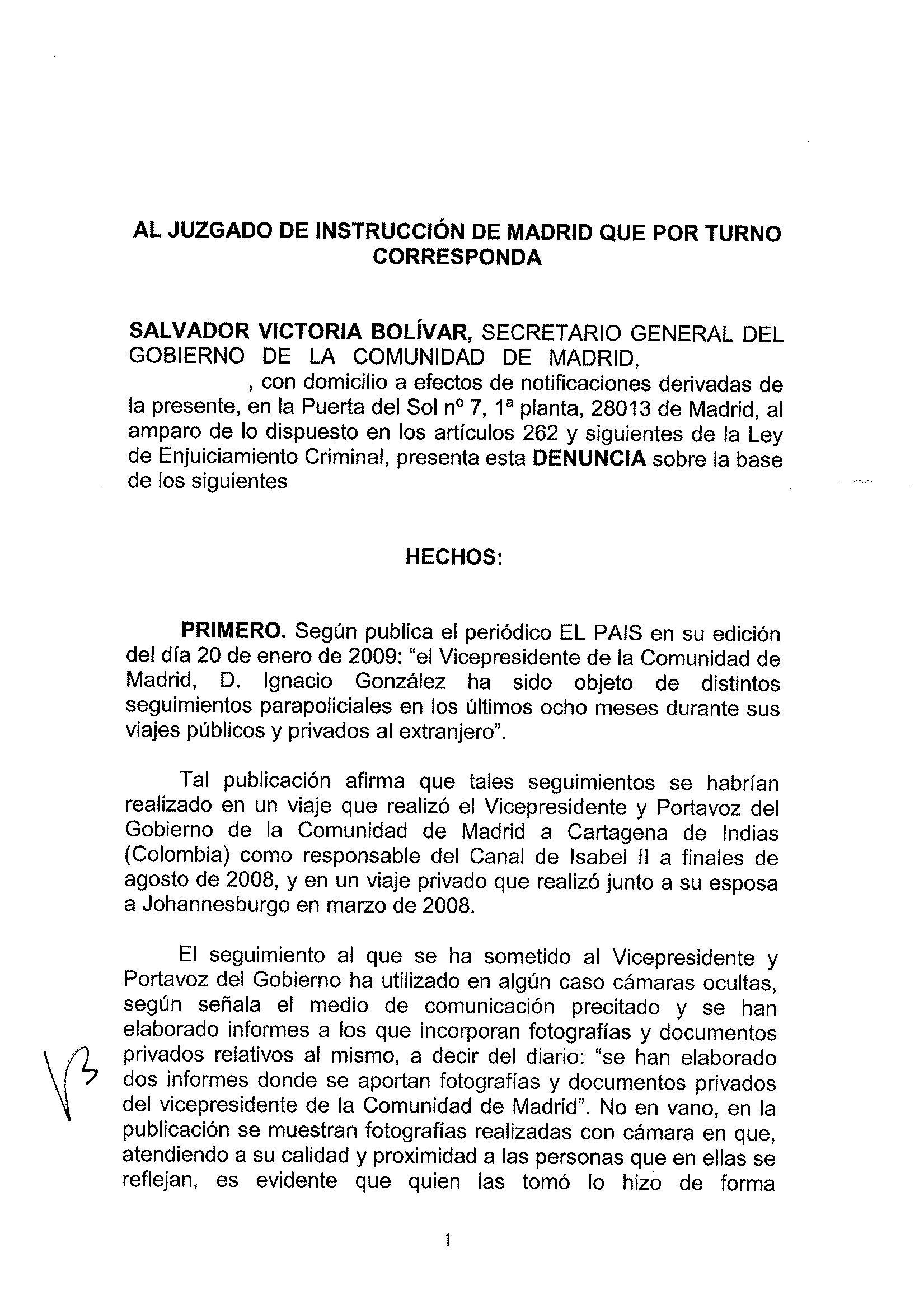 La presidenta de la Comunidad de Madrid, Esperanza Aguirre, ha expresado hoy su deseo de que la Fiscalía investigue el supuesto espionaje al que habría sometido su vicepresidente, Ignacio González. Sin embargo, el deseo de la presidenta ha topado pronto con la reticencia de los ... responsables de la Fiscalía en Madrid. En declaraciones a a Ep, el fiscal jefe de la Auidencia Provincial de Madrid, Eduardo Esteban, ha afirmado que «no hay datos suficientes para abrir una investigación». Aguirre ha explicado que se ha dirigido a los servicios jurídicos del Gobierno Regional para que requieran a la Fiscalía que investigue si, tal y como ha publicado el diario El País, el vicepresidente regional, Ignacio González, ha sido sometido a seguimientos, espionajes y grabaciones. Pero Esteban ha aventurado que no hay indicios suficientes para abrir una investigación de oficio. Según el fiscal, «no es un hecho delictivo que se grabe a una persona pública» y «sólo está acreditado que le grabaron unas fotos». Según la teoría de este representante del MInisterio Público, «es González quien tiene que actuar en el caso si lo considera oportuno». Así las cosas, parece que el propósito de los responsables del Gobierno Regional de que la Policía actúa de oficio se verá truncado.