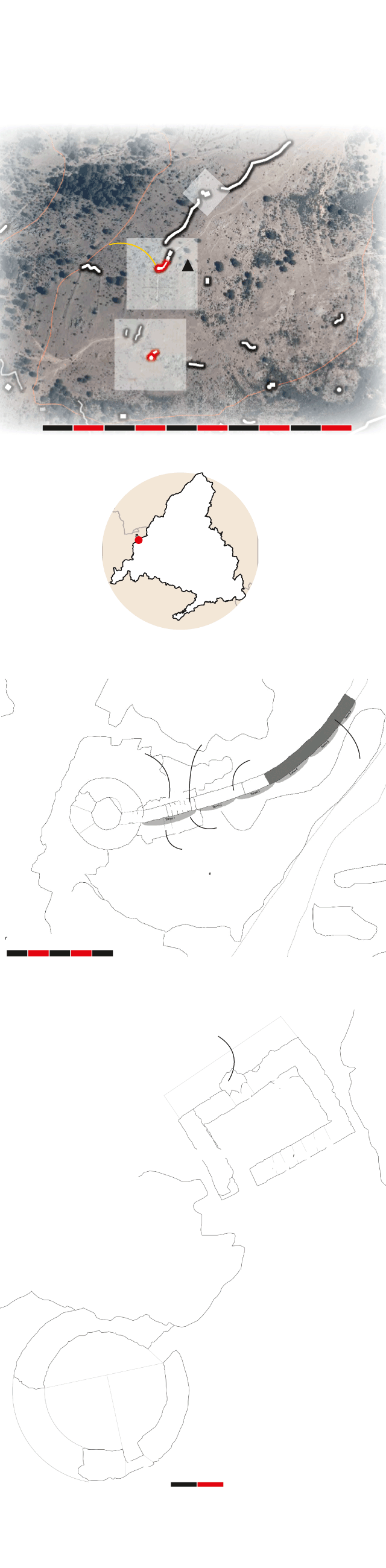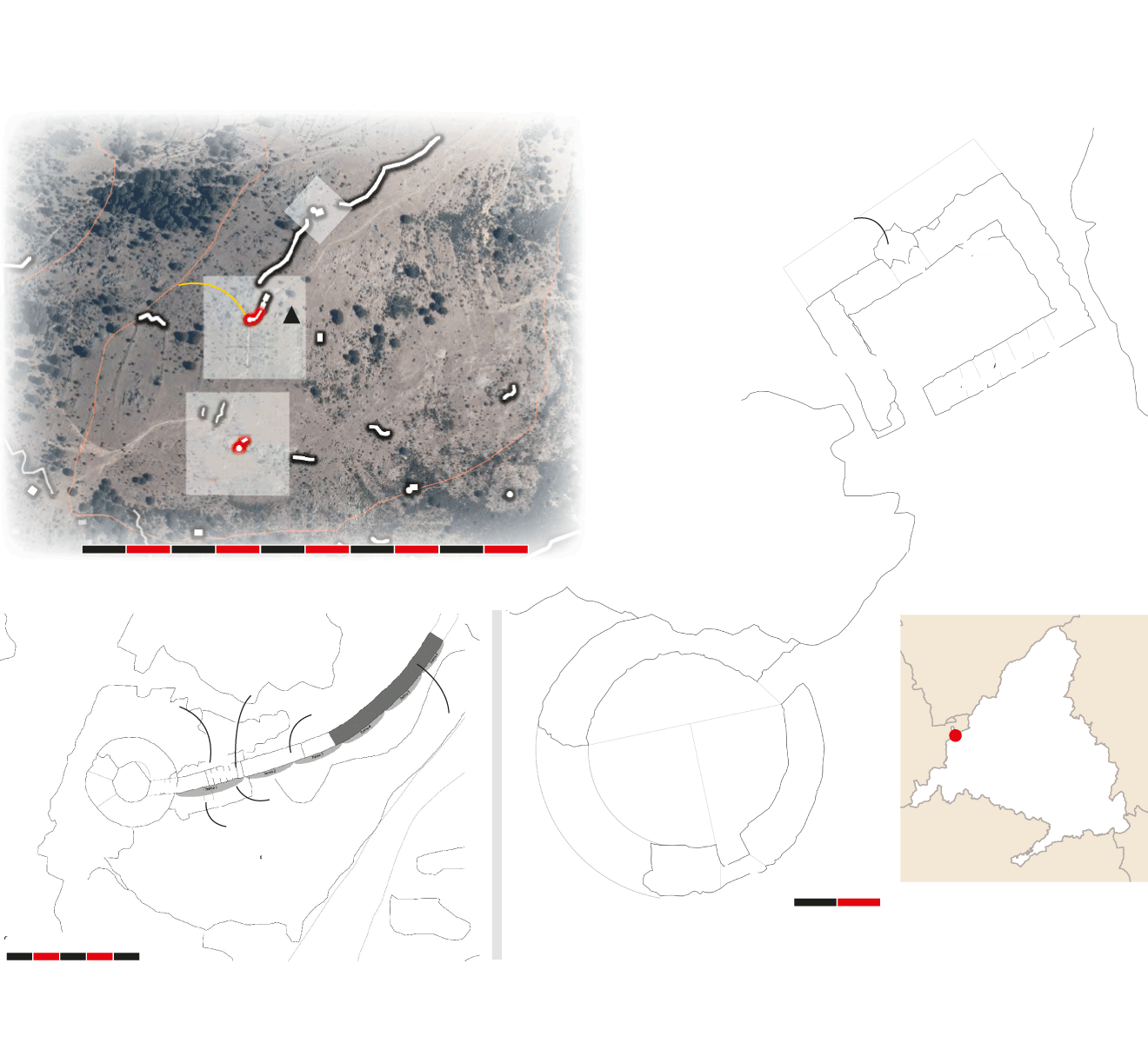 Otras dos estructuras militares recuperadas en la falda opuesta de la loma estaban situadas a apenas 5 metros la una de la otra, lo que hace sospechar que estuvieron conectadas con algún tipo de parapeto. La primera es circular, de casi 5 metros de diámetro, con la puerta al nordeste y una tronera orientada al sur –hacia las posiciones franquistas–. Parece un gran nido de ametralladora, con una altura que en su punto mayor llega a 1,70 metros.