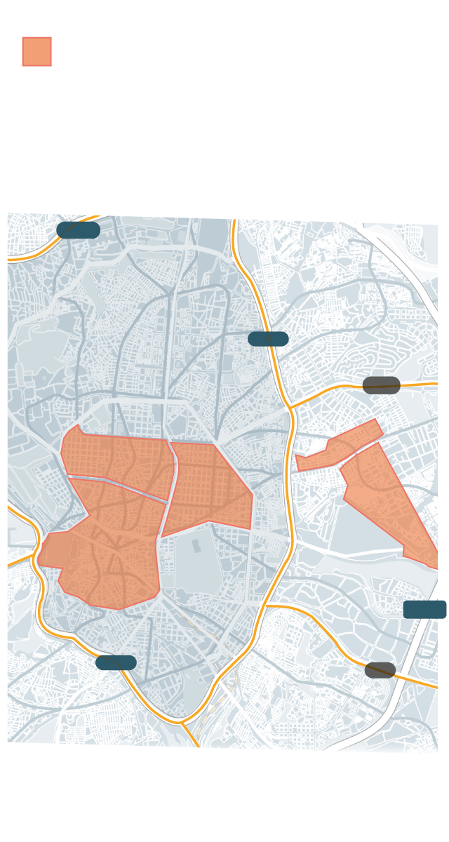 El refuerzo afecta a los ejes comerciales de los 21 distritos de la ciudad, pero existen zonas principalmente conflictivas: todo el distrito de Centro; Salamanca, excepto Guindalera y Fuente del Berro; Quintana y Pueblo Nuevo, en Ciudad Lineal; y Chamberí, menos Vallehermoso y Ríos Rosas.