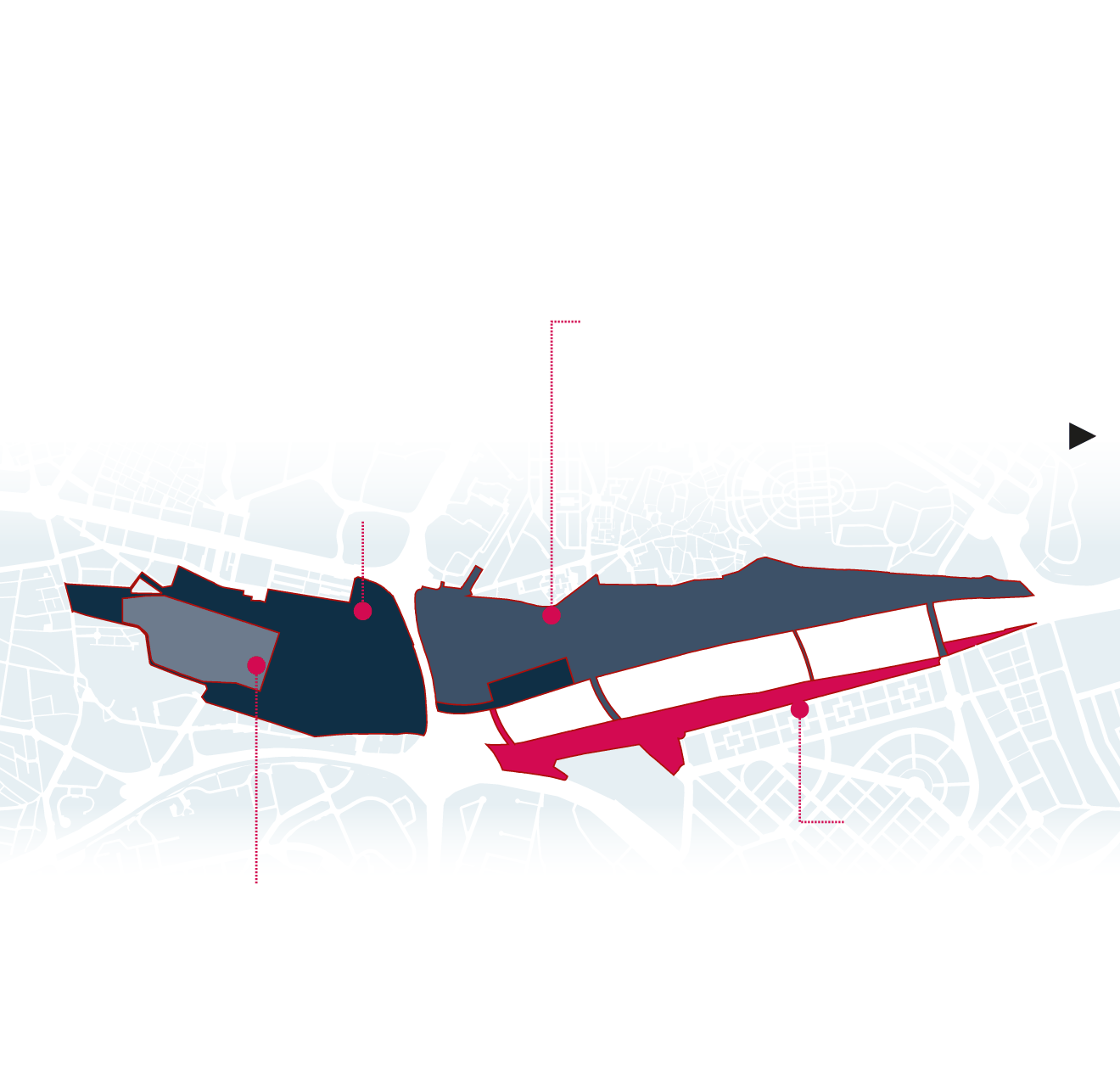 A efectos de gestión, el proyecto se divide en cuatro ambitos urbanísitcos que se rigen bajo las mismas directrices de sostenibilidad, innovación y regeneración urbana, respetando en todo momento las particularidades físicas y de identidad de cada uno de ellos