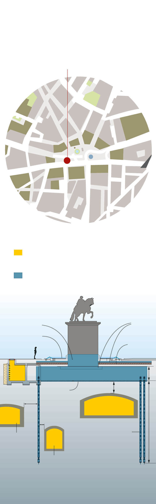 Sobre las tres largas patas se apoya un entramado triangular de vigas, la tabla de la 'mesa', de 2 metros de profundidad, que permite unir los apoyos, repartir las cargas y conducir el peso a las profundidades de Sol. Bajo rasante queda una estructura singular capaz de aguantar las toneladas del monumento y sortear los espacios subterráneos existentes. El intrincado armazón estará oculto. En superficie, una bonita fuente lamerá el pedestal sobre el que cabalga Carlos III y que podrán admirar las 250.000 personas que cruzan a diario la plaza.