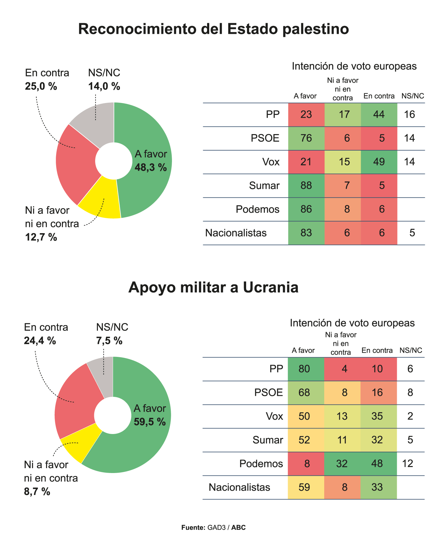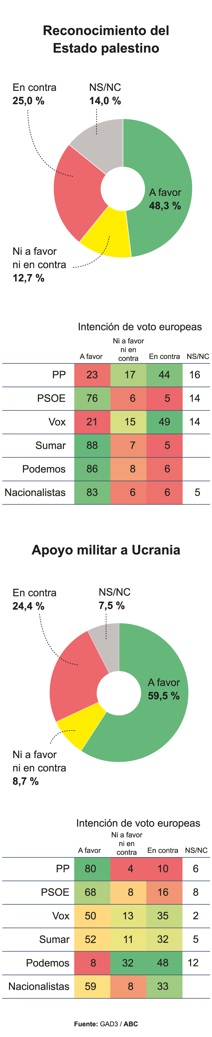 Dos de las decisiones más controvertidas del Gobierno en los últimos días tienen como escenario el marco internacional y ambas han provocado más división en la sociedad española. Así lo refleja la encuesta de GAD3 para ABC que este periódico viene desgranando desde ayer, según ... la cual no llegan ni a la mitad (48,3%) los españoles que están a favor de reconocer el Estado palestino.