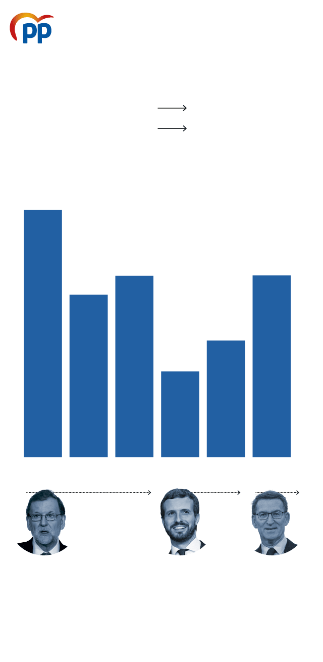 En abril de 2019 el PP llegó a hundirse hasta los 66 escaños quedándose en un 16,69%. En la repetición electoral de noviembre fue el batacazo de Ciudadanos lo que permitió una leve recuperación. Se lograron 89 escaños y un 20,99% de los votos. El resultado de este domingo lleva a Alberto Núñez Feijóo a unos números casi calcados a los de Mariano Rajoy en la repetición electoral de julio de 2016. Feijóo obtuvo 136 escaños con un 33,05% de voto. Mientras que Mariano Rajoy alcanzó 137 diputados y un 33,01%.
