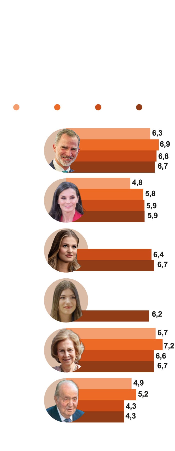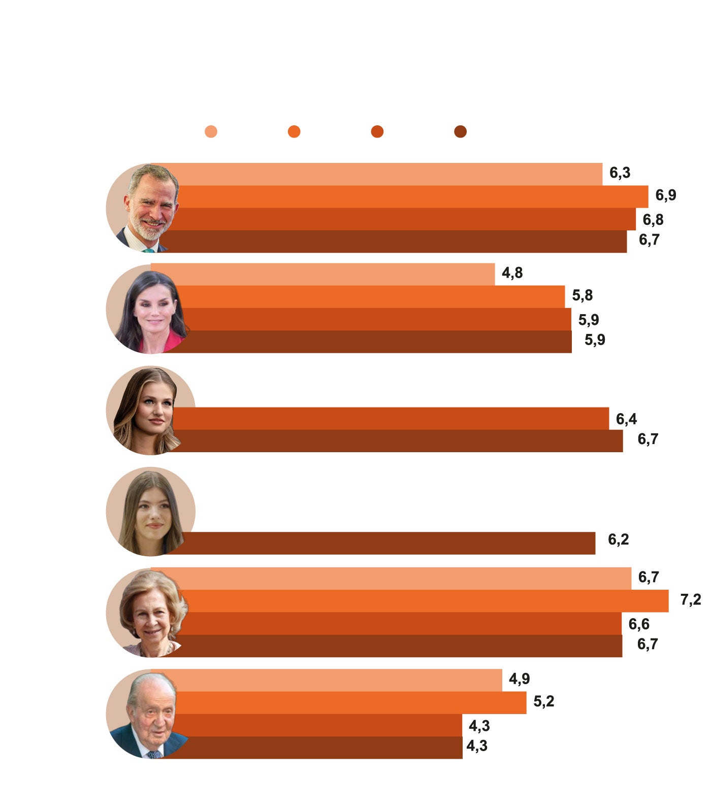 En la nota que los españoles ponen a la Familia Real existe cierta estabilidad. Por ejemplo, en los últimos seis años Don Felipe se mueve entre el 6,3 del año 2018, el 6,9 de 2020 y el actual 6,7. En el último sexenio, la Reina Letizia, que hoy obtiene un 5,9 sobre diez, ha crecido desde el suspenso que registró en 2018 (4,8), aunque ya en 2020 escaló al 5,8.
