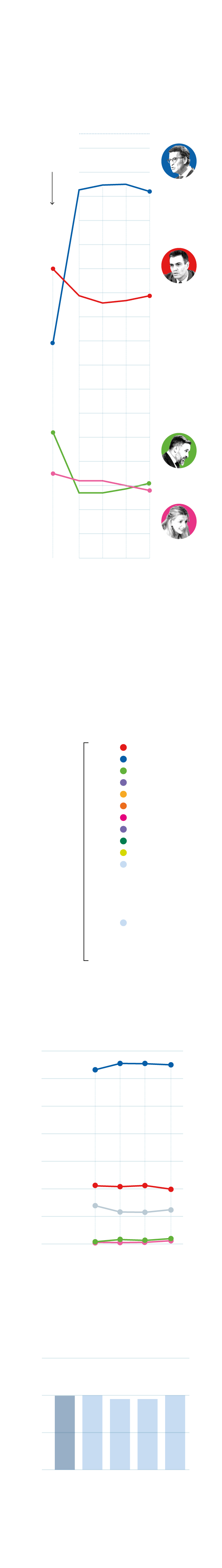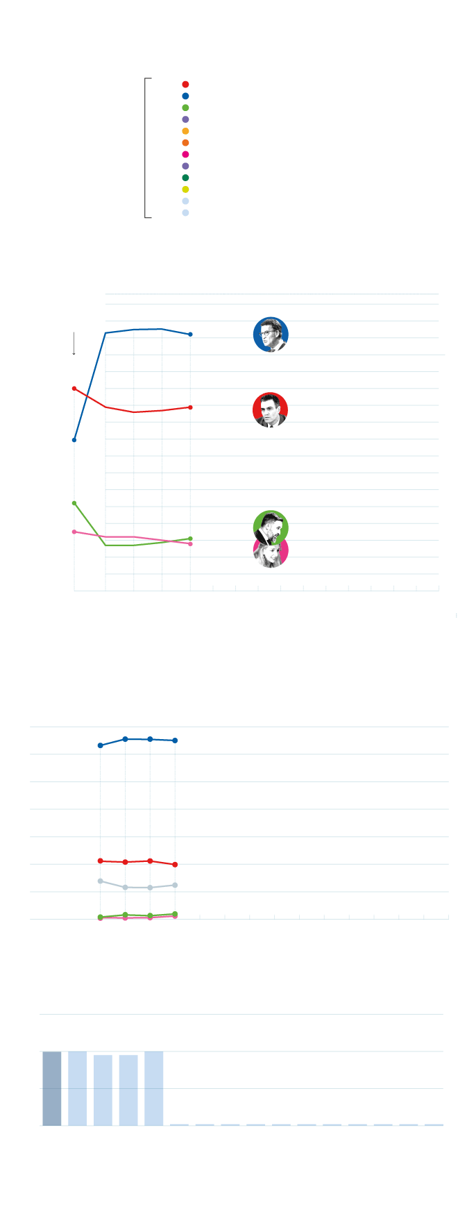 El segundo pulso, menos decisivo pero más ajustado, es el que mantienen Santiago Abascal y Yolanda Díaz. El líder de Vox remonta para recuperar la tercera posición, tras media semana en la que empezó con 27 diputados y ya va por 31 al superar por primera vez el 12% de papeletas. La candidata de Sumar, por contra, pierde medio punto respecto al 13% que acariciaba al principio de semana y cae de 32 a 28 diputados en solo dos días. Se invierte así la relación de fuerzas entre Vox y Sumar a favor de los de Abascal.