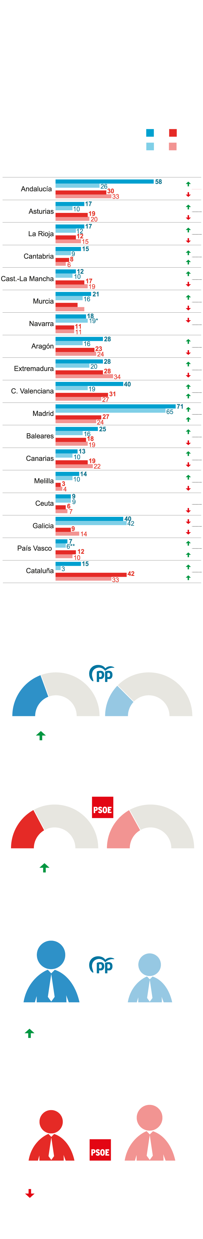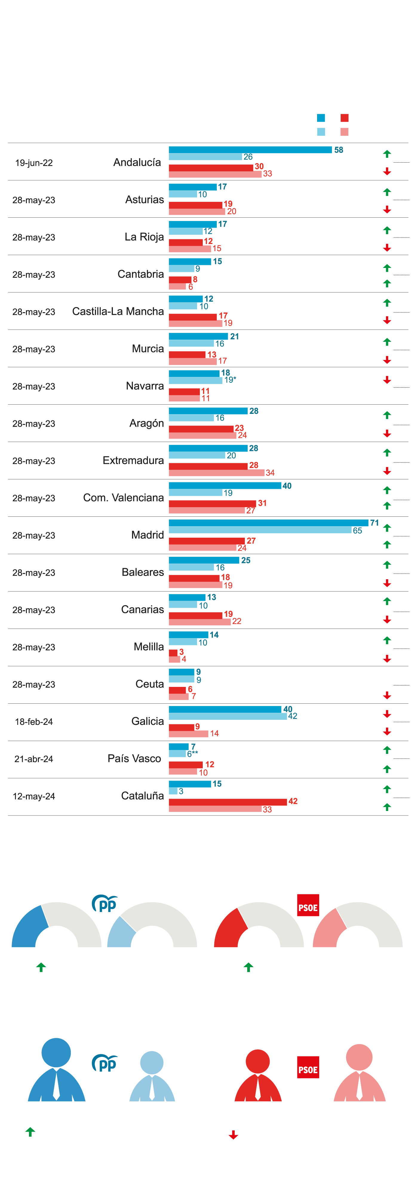 En medio de ese crecimiento generalizado solo ha habido un par de excepciones y ambas están disfrazadas. En Navarra, donde el PPacudía esta vez en solitario en lugar de la coalición que protagonizó en las anteriores elecciones con Unión del Pueblo Navarro (UPN), y en Galicia, donde el PP se dejó dos escaños aunque mantuvo la mayoría absoluta y subió en votos. Retroceso parcial que parecía inevitable, pues venía de un resultado gigante en 2020, cuando logró de la mano de Feijóo 42 de los 75 escaños posibles.