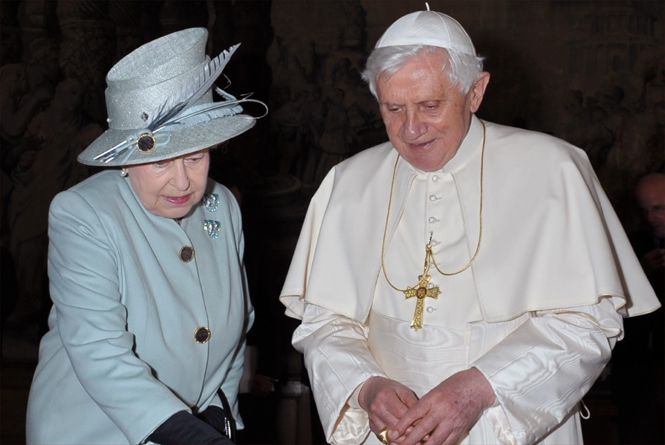 Con traje de chaqueta azul cielo, en un encuentro con Benedicto XVI