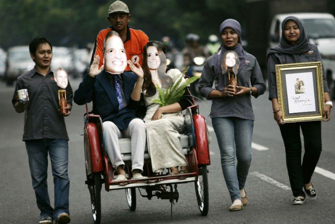 Las caretas de la Reina Isabel II y los novios el Príncipe Guillermo y Kate Middleton abundan en Londres, horas antes de la boda.