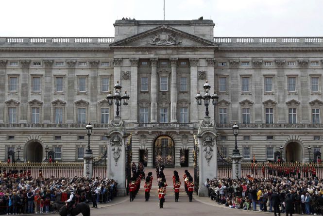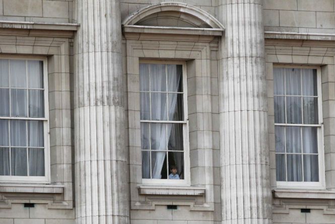 Un niño se asoma por una de las ventanas del Buckingham Palace.