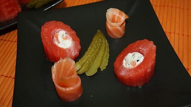 -Se llena los tubos de sandía con la mezcla de quesos y decorar al gusto.