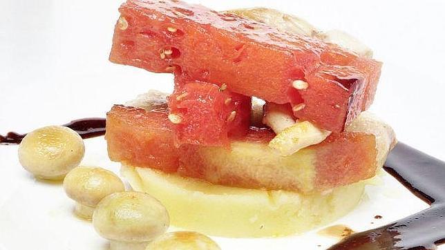 -Preparar el plato poniendo el puré de patatas en el centro y se hace una torre encima con la sandía y el pollo. Acompañar con los champiñones y regar con la salsa.