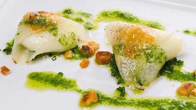 El cocinero Bruno Oteiza sorprende con un original plato de raviolis de melón rellenos de queso y acompañados de maíces fritos y aceite de rúcula.
