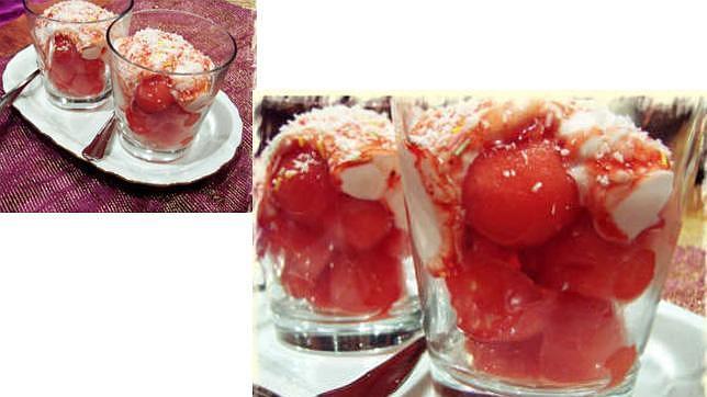 -Llenar el fondo del vaso con las bolitas de sandía, cubrirlas con el petit suise de fresa.