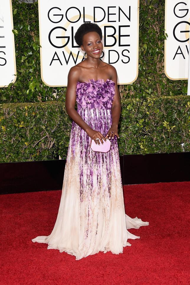 AFP Con un peinado poco favorecedor pero un vestido espectacular se ha presentado la actriz revelación de 2014 en los Golden Globes. Lupita, que se atreve con todo, llevaba un modelo de Giambattista Valli Couture, con top de pétalos en relieve y una falda plisada de gran caída en tonos degradé. Un resultado exótico y atrevido, pero elegante.