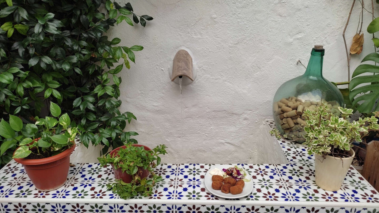 Las croquetas y el pequeño patio interior de la taberna, con su fuente, son capaces hasta de inspirar el bodegón que vemos en las imágenes y que se podría titular en tono de broma «rumor de agua, flores y croquetas».
