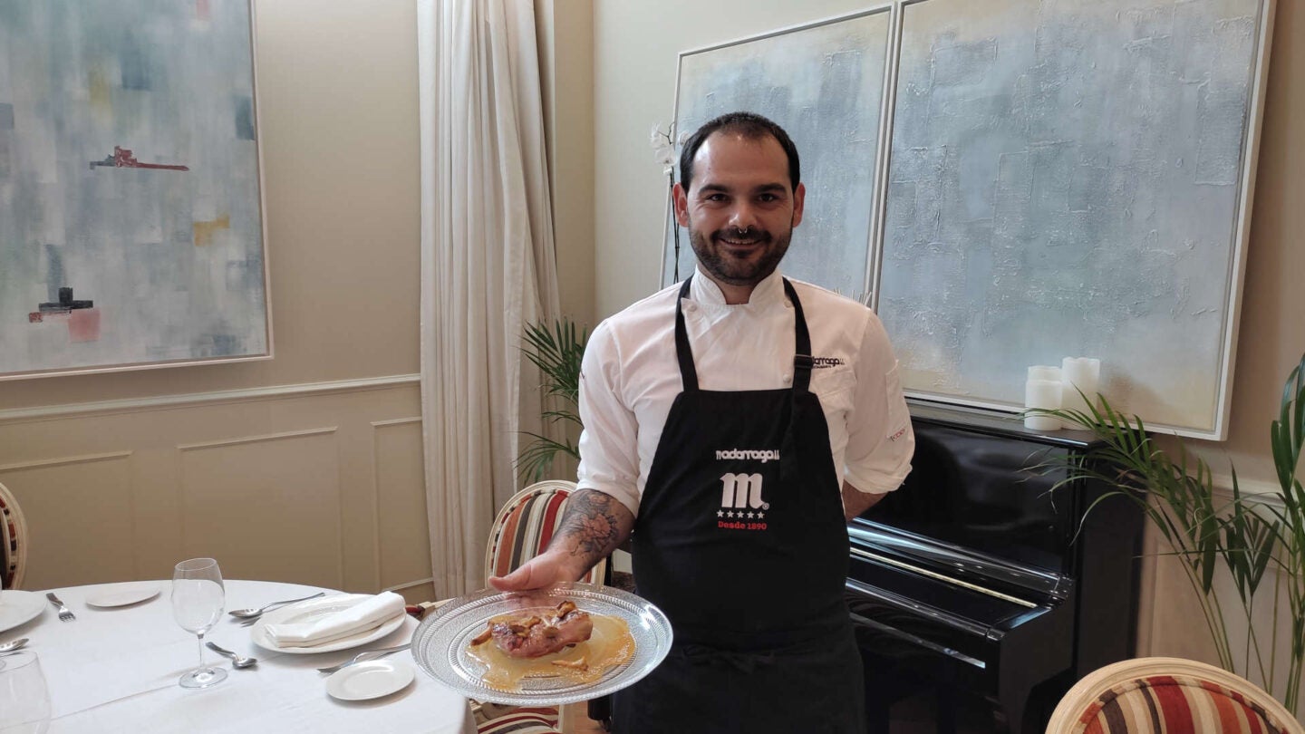 Actualmente su cocinero es Javier Murillo, que procede de Patio Romano. Gurmé ABC repasaba recientemente su trayectoria y preferencias culinarias en esta entrevista . En esta ocasión ha escogido un plato de casquería, el único que ofrece de momento Adarraga, pero muy especial como veremos: las manitas deshuesadas con trufa, cebolla caramelizada y la salsa de su propio jugo.