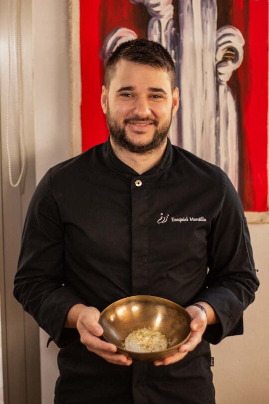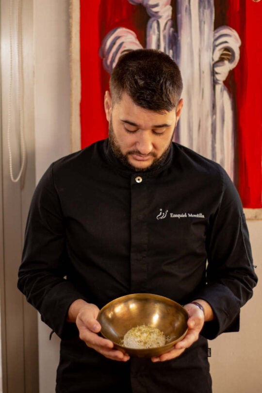 Y así surgió este singular postre que prescinde de la parte dura de la tarta de queso. Pero la tarea no fue fácil. Primero hicieron en ‘Alma Ezequiel Montilla’ una prueba entre varios quesos. Buscaban uno con personalidad y que fuese de España. El toque ahumado del Idiazábal se impuso finalmente a los demás. El parmesano aportaría una toque salado y frescura el pistacho.