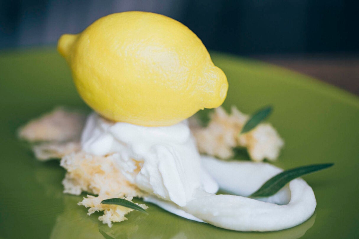 Y así optó por una técnica basada en elaborar figuras con azúcares fundidos, para lo que hicieron en Regadera un molde de silicona alimentaria para hacer la base del plato con la forma de los propios limones. Ese molde se rellena con la espuma del zumo, en la base se pone la crema del albedo, el helado que sirve para apoyar el limón es elaborado con las pieles «y luego hacemos un bizcocho instantáneo en el microondas con limón en polvo y yogur de limón». Para terminar está todo de decorado con unas hojitas de hierbaluisa «que dan una fragancia cítrica espectacular». Se sirve en una vajilla que simula una hoja fabricada con una especie de látex por un diseñador japonés