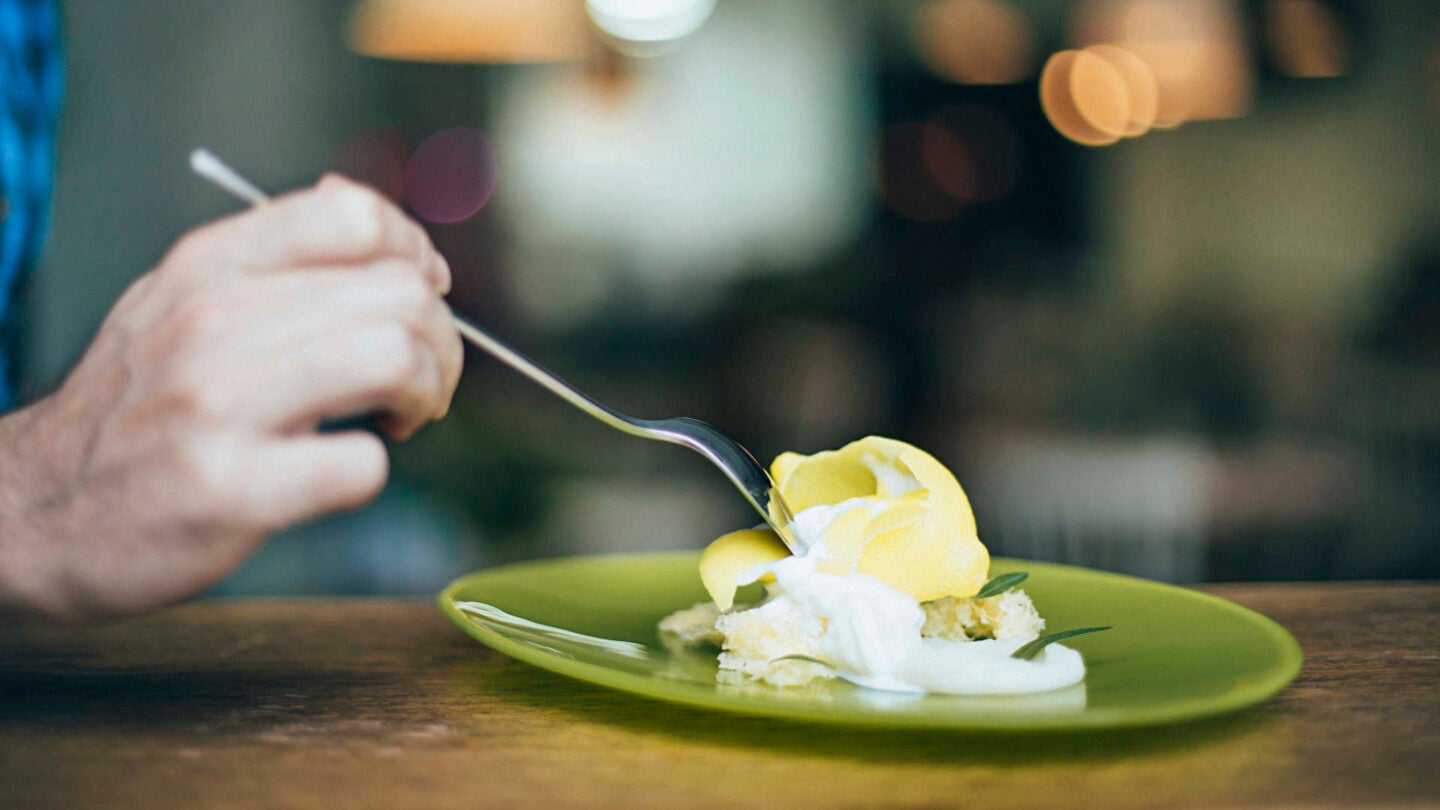 El resultado es una pequeña maravilla lista para sorprender al comensal y poner un broche de oro, de oro limón, a un almuerzo o cena en Regadera.
