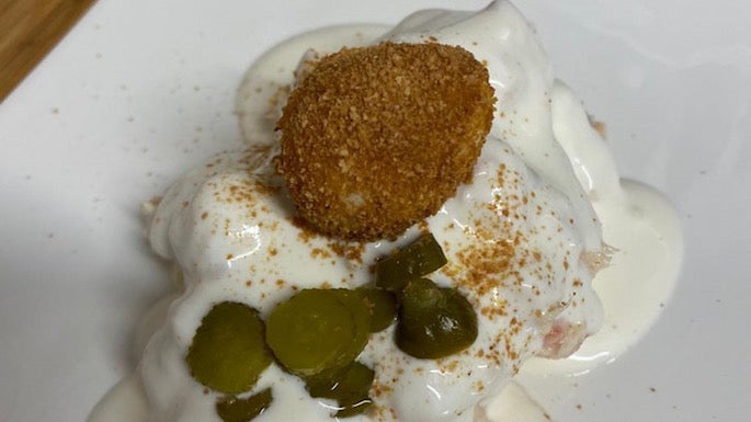 La ensaladilla está casi lista. Se le pone un poco de mayonesa por encima, “aligerada previamente con algo de agua”, se pone el huevo, que tiene la yema sin terminar de hacer, y un poco de las especias. Cuando se abre para tomar, esa yema es la que le da el punto diferente, un toque especial que le da un plus de sabor.