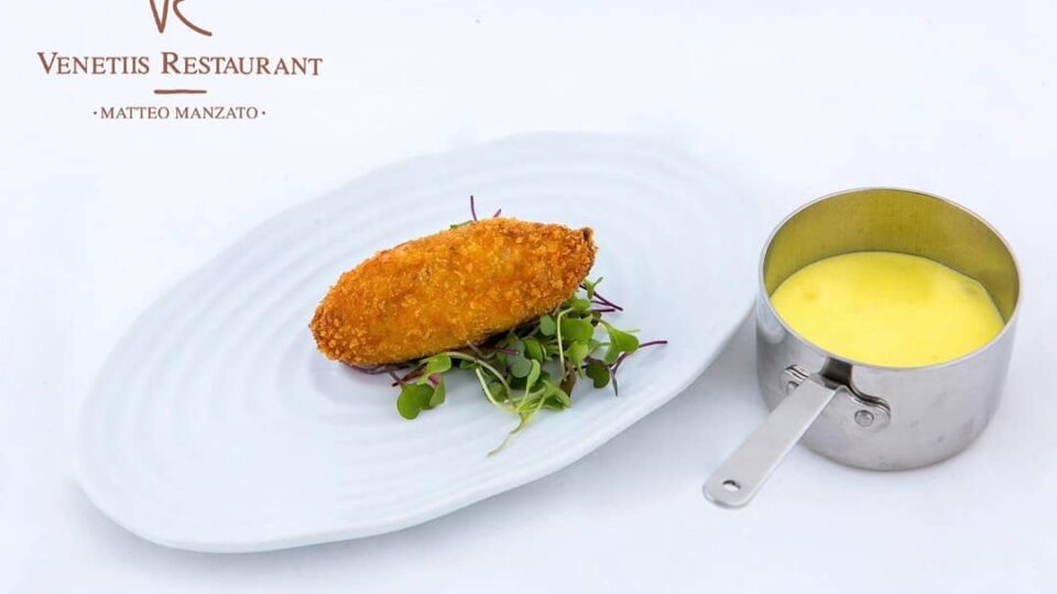 “Es un bocadito de cielo”, dicen desde Venetiis. Y es que esta croqueta de ossobuco alle milanese calca uno de los platos tradicionales italianos en cada bocado. Hecha de ossobuco, una especie de “hueso hueco” que hace referencia al corte de carne vacuna. En España es más conocido como osobuco o jarrete. Esta croqueta se acompaña con una espuma de arroz y azafrán : “Es una manera de recordar el abbinamento típico del ossobuco en Milán”, aseguran.