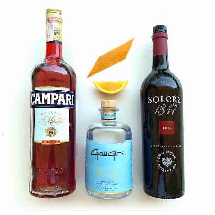 Se van a necesitar tres ingredientes : Ginetra, Campari Bitter y Sherry. Daniele comenta con Gurmé Málaga que él suele utilizar Gaugin Beach, “una ginebra belga con raíces andaluzas” y el Cream Solera 1847 de Gonzalez Byass (el sherry).