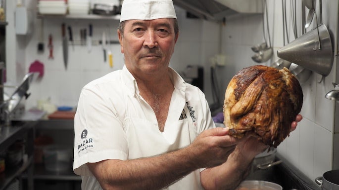 Iniciar sesiónLos martes toca jamón de pata asado y en GURMÉ Málaga lo sabemos. ¿Qué mejor día para visitarlos? Lo prepara Miguel Alba con vino blanco, aceite de oliva, pimienta negra molida, sal y agua. “ Al natural, sin aditivos, y al horno, hasta ... que se asa. Usamos una bandeja baja y lo tenemos unas cuatro horas cocinándose ”, nos comenta. El de esta semana pesa 12 kilos y a las 10.30 de la mañana ya han salido bastantes pitufos y rebanadas de pan con este preparado en el restaurante Los Alba, en Teatinos.