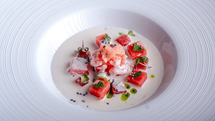 1. Ajoblanco de coco con sandía y sésamo negro, Palmira (Mijas)