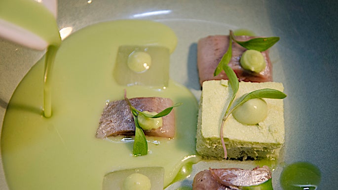 9. Gazpacho verde, sardinas encurtidas, pepino y aceituna manzanilla, Back (Marbella)