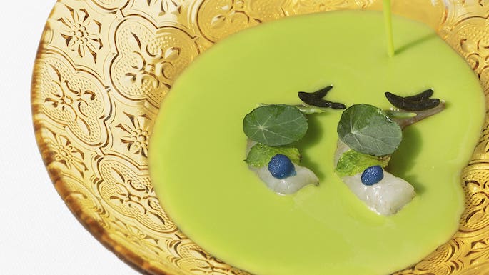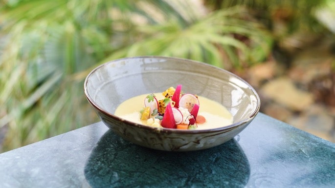 3. Sopa de maíz ahumado con mojo verde de aguacate y verduras encurtidas, Boho Club (Marbella)