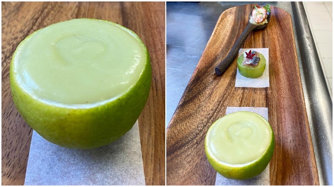 2. Lima rellena de gazpacho de piparras con corazón de tomate y gamba blanca de Málaga, El Lago (Marbella)