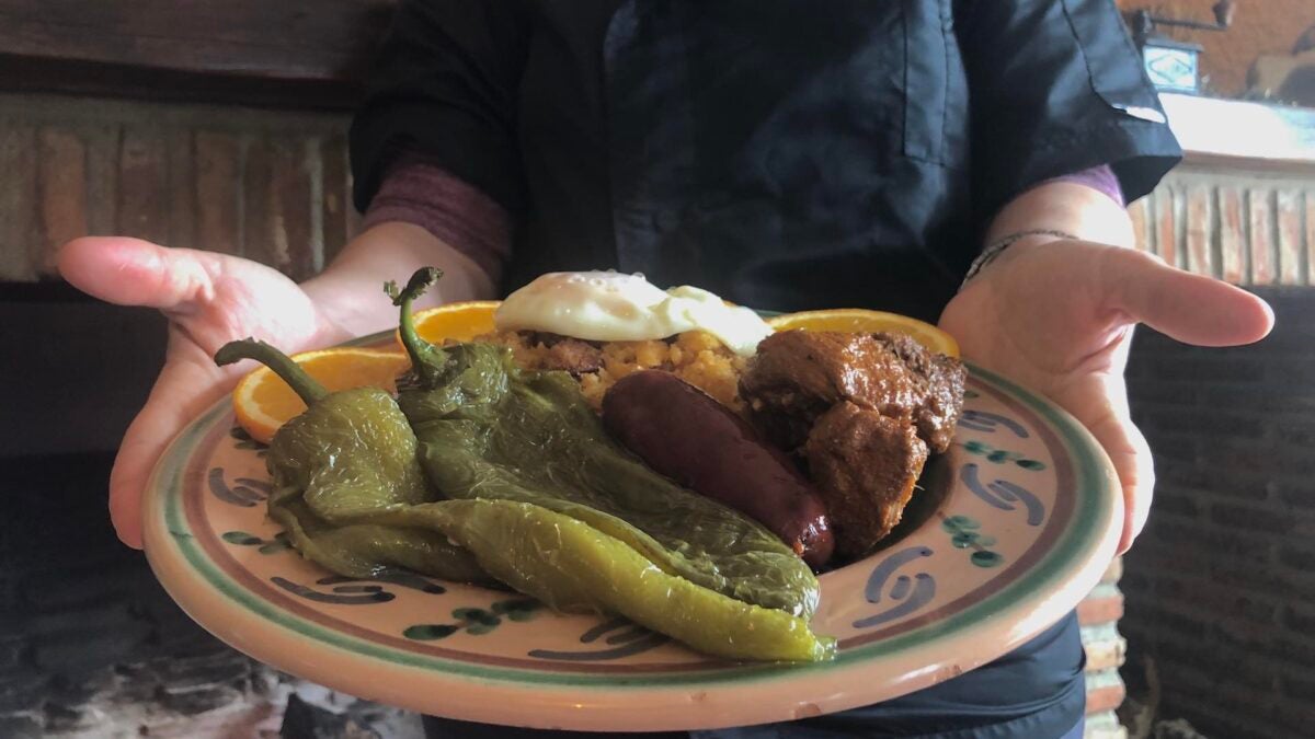 Caserío de San Benito ha dado con la clave para que este plato que suele ser contundente no resulte nada indigesto. Para eso intentan no añadir grasa en exceso. “Ni tocino ni nada”, nos explican, “porque además sino es que se ponen rancias muy rápido”. Se presentan con verduras fritas del tiempo, con uva, naranja, granada, zanahoria morá… “Depende del fruto de temporada que haya, porque también usamos el melón”. El acompañamiento final, y por supuesto siempre que el comensal así lo quiera, es un huevo frito, chorizo, pimiento frito y morcilla.